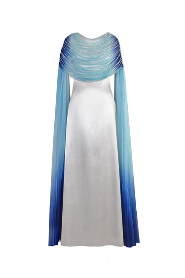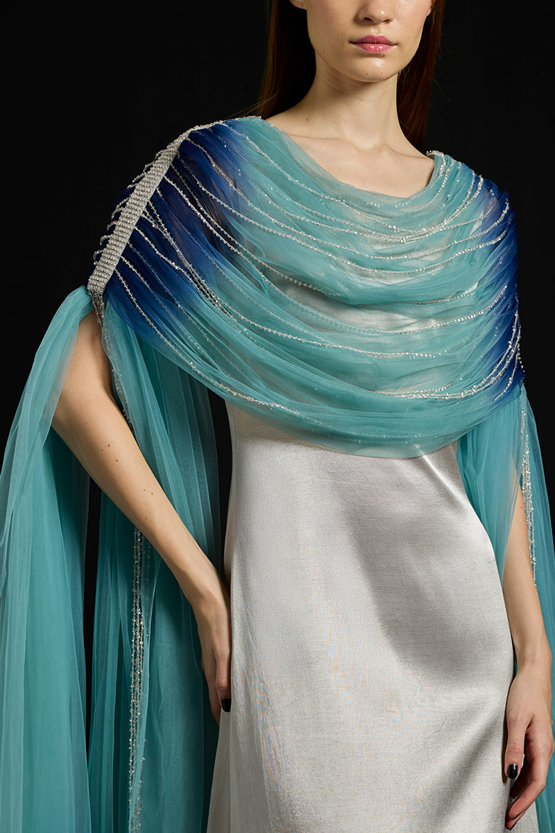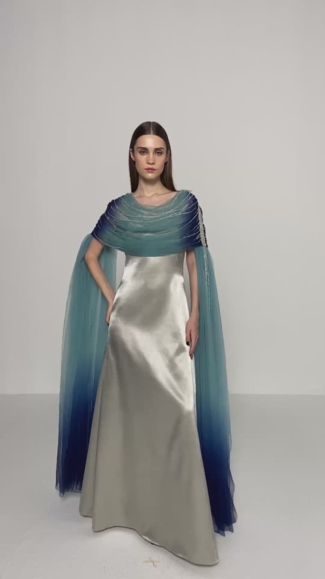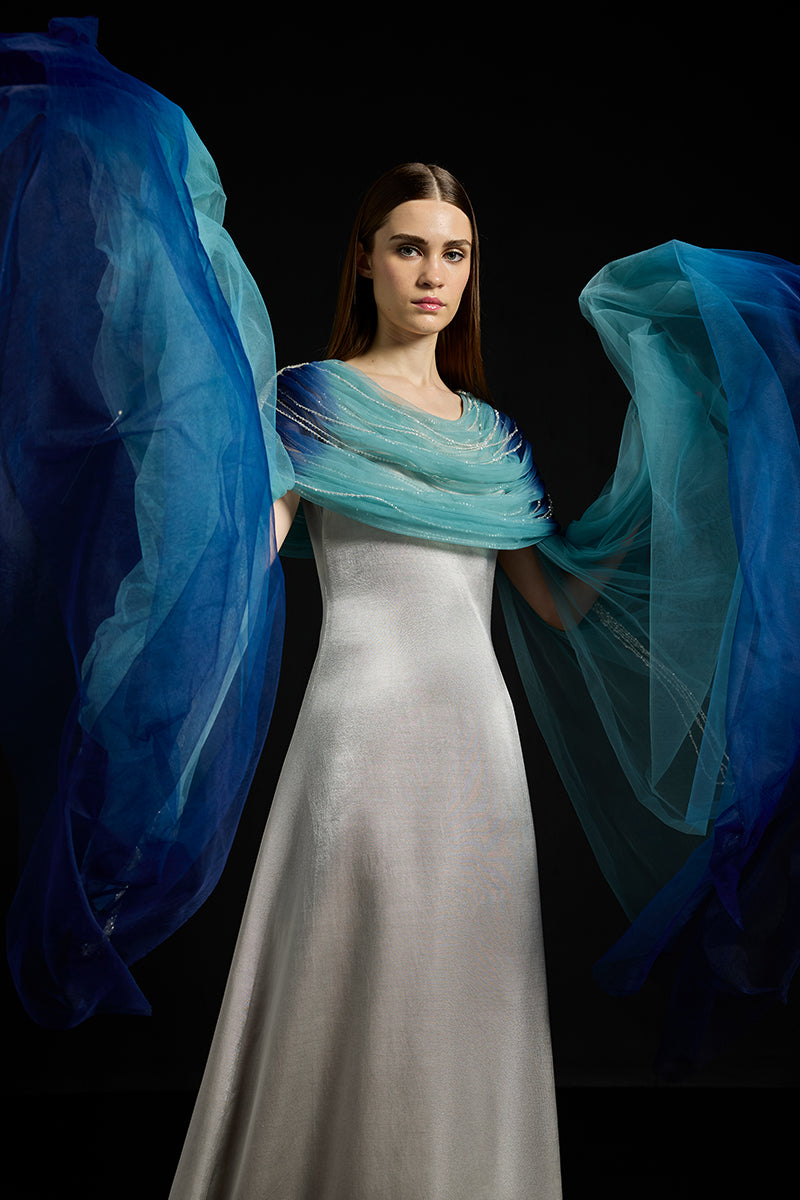 - Satin dress with a hand-dyed and gathered Tulle drape and fall-panelled sleeves