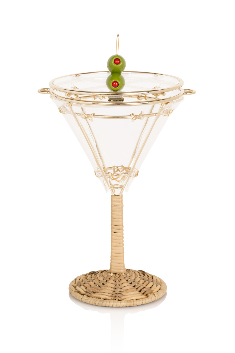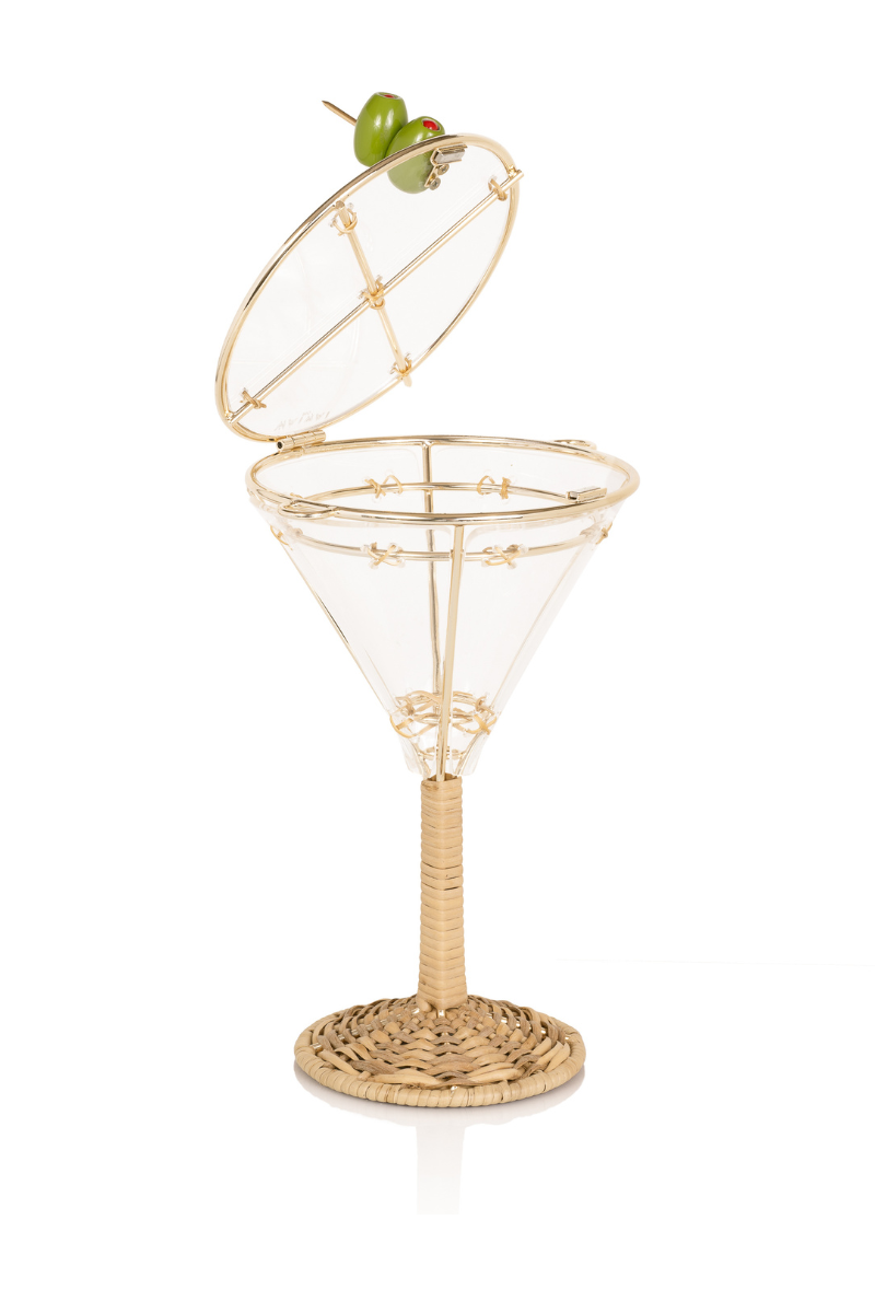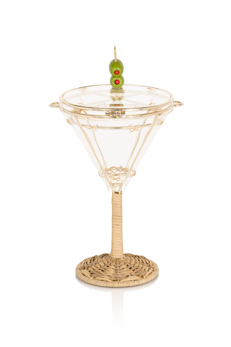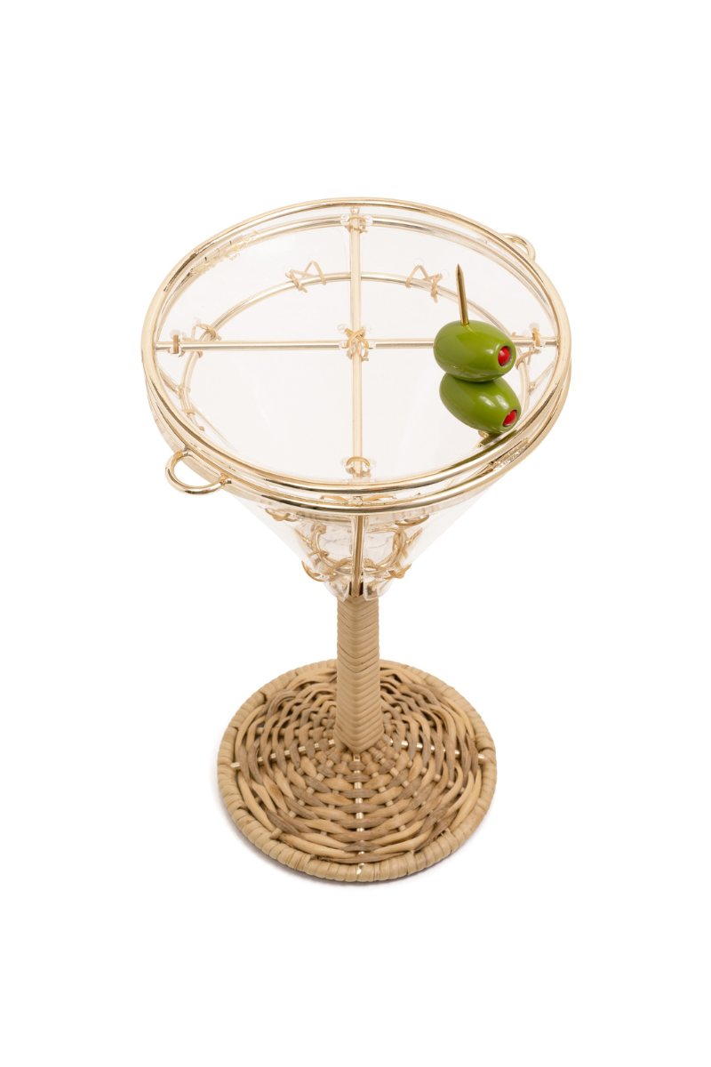 Drink cup-shaped bag with metal frame and braided wicker. Comes with leather shoulder strap.
