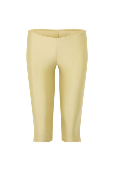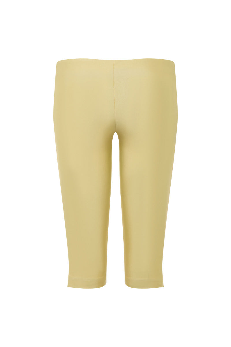 Dusty Butter Yellow Capri Pants crafted from swimwear fabric, featuring a low-waisted fit with a side slit and a discreet side zipper. Designed for a sleek, body-hugging silhouette.