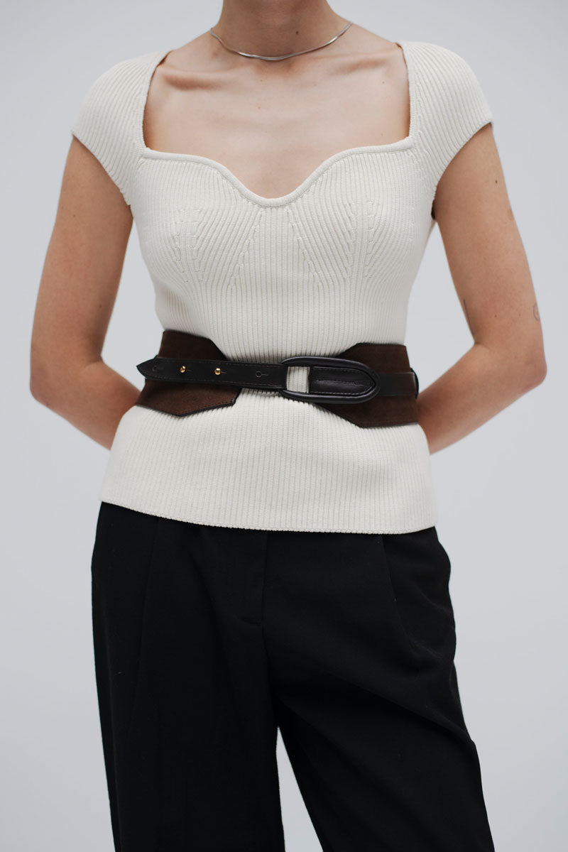 Our belt is a balance between sculptural and wearable. Handmade in Colombia from smooth suede our design features a wide band and and an overlapping thin belt and our leather hardware.