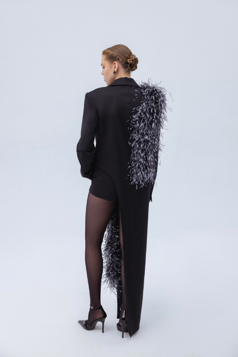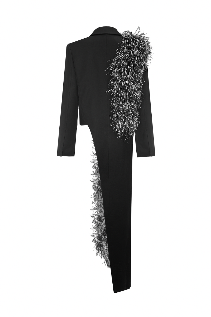 This elegant wool jacket enhanced with exquisite feather detailing brings sophisticated texture and contemporary elegance to refined outerwear styling. The classic silhouette combines timeless craftsmanship with modern design elements, creating an essential statement piece for discerning wardrobes.