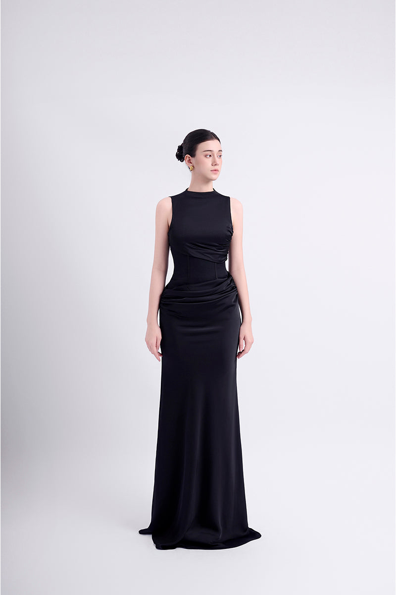 - Outer silk layer with asymmetric gathered detailing