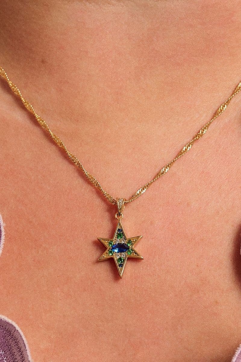 Prepare to look out of this world with this standout pendant necklace. A gorgeous marquise cut Sapphire coloured Cubic Zirconia at the centre surrounded by a scattering of Emerald Green and Clear Cubic Zirconia sparkles, finished with glimmering 18k Gold Plating.