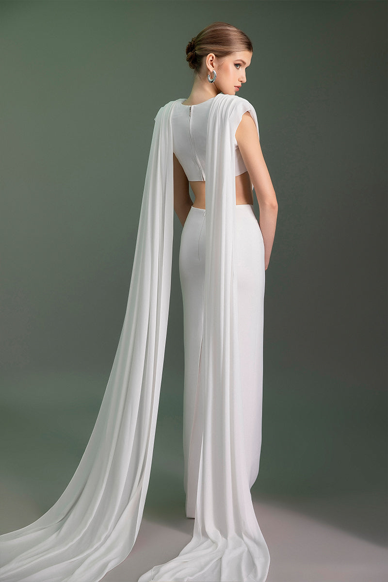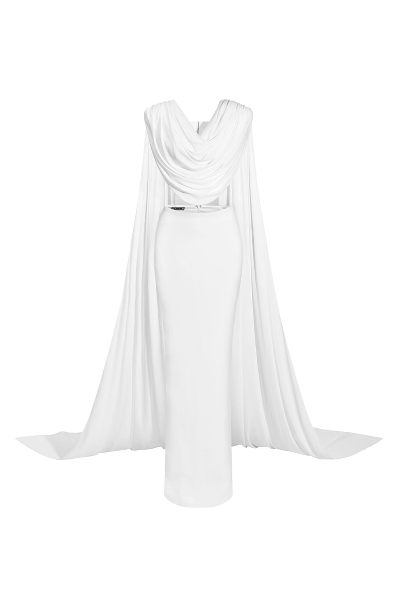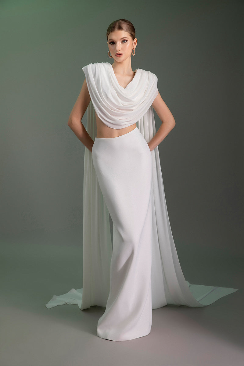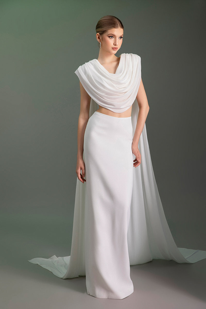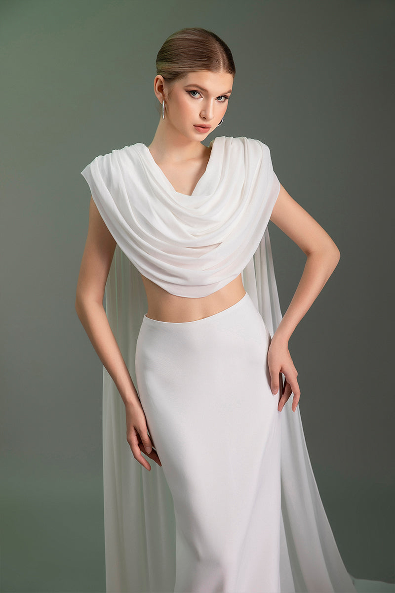 - Voluminous cowl neckline that drapes richly over the shoulders, secured around the neck