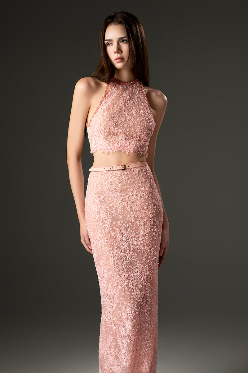 The Mesh Lace Halter Top and Matching Column Skirt create a soft, luminous ensemble crafted from airy mesh lace. Petite sequins shimmer gently across the surface, adding a subtle glow that moves beautifully with the body. The halter top brings a delicate lift to the neckline, while the sleek column skirt elongates the silhouette with refined minimalism. Romantic, modern, and effortlessly feminine