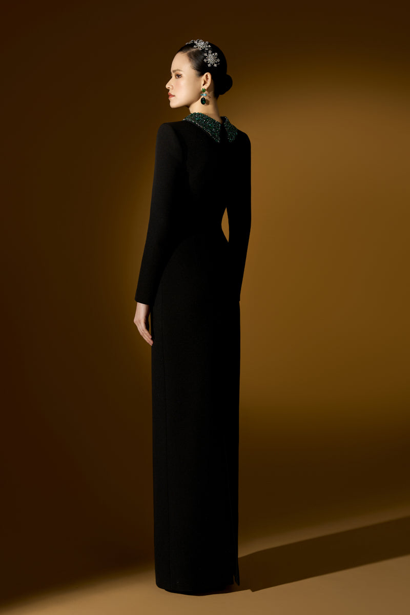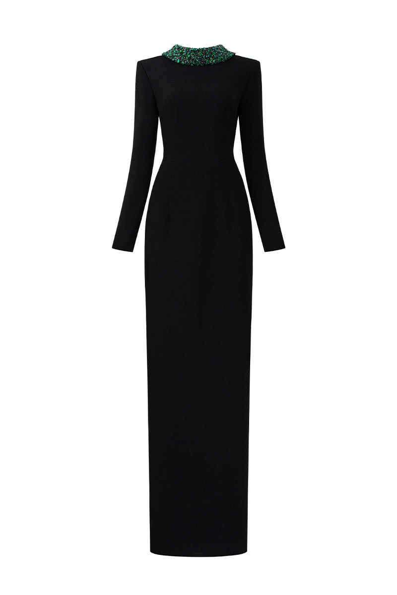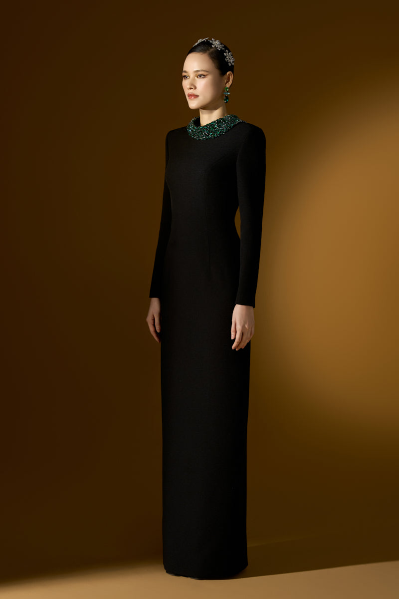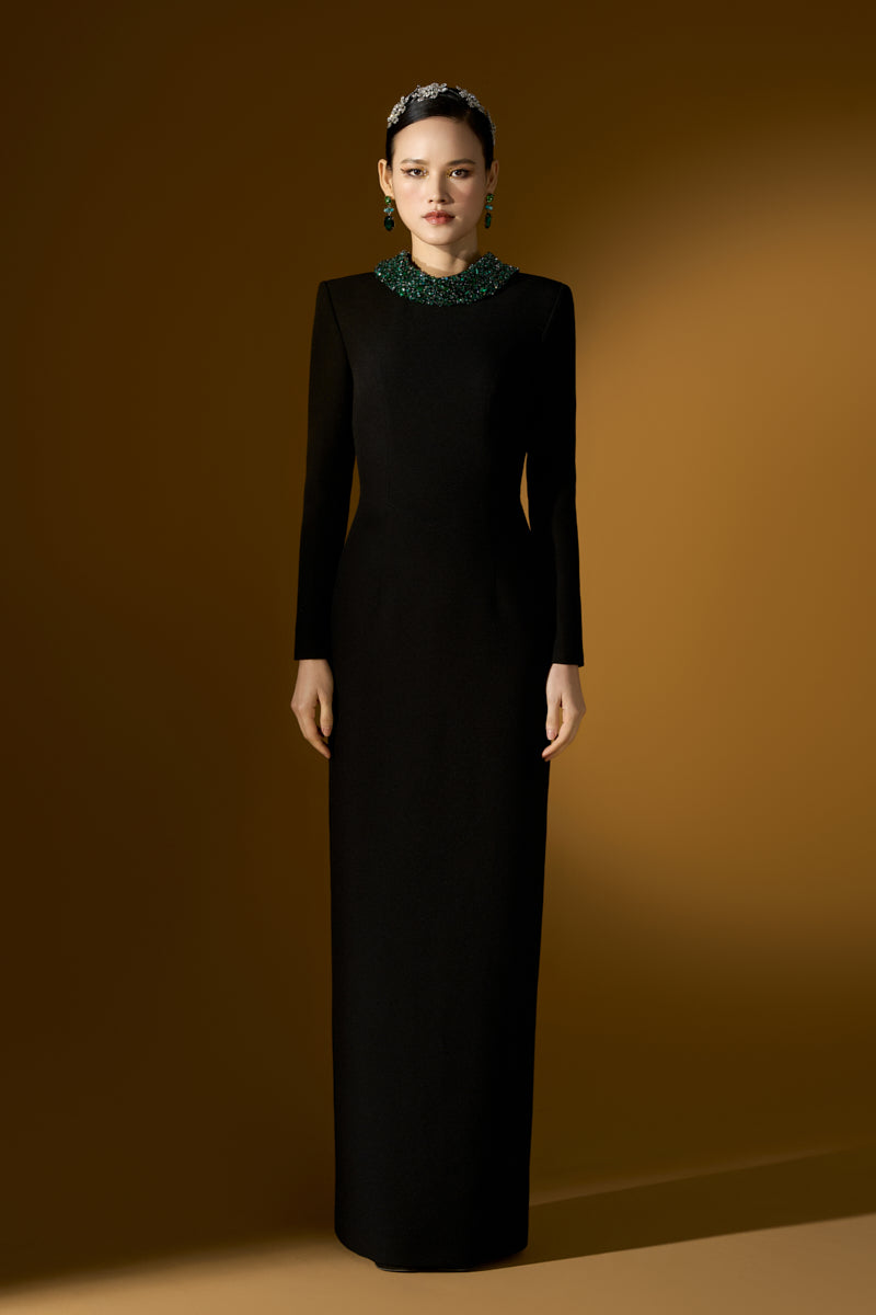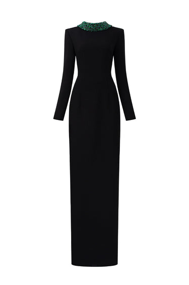 This Floor-Length Column Gown is a bold and luxurious statement piece. With its dramatic long sleeves and a deconstructed collar, the gown exudes both modern sophistication and artistic flair. Crystals and stones in varying colors are meticulously embellished throughout, adding an opulent touch of sparkle that draws the eye. Crafted from premium Scuba, the gown offers a sleek, flattering fit that gracefully follows the body's curves, making it a perfect choice for a high-profile event where elegance and boldness combine effortlessly.