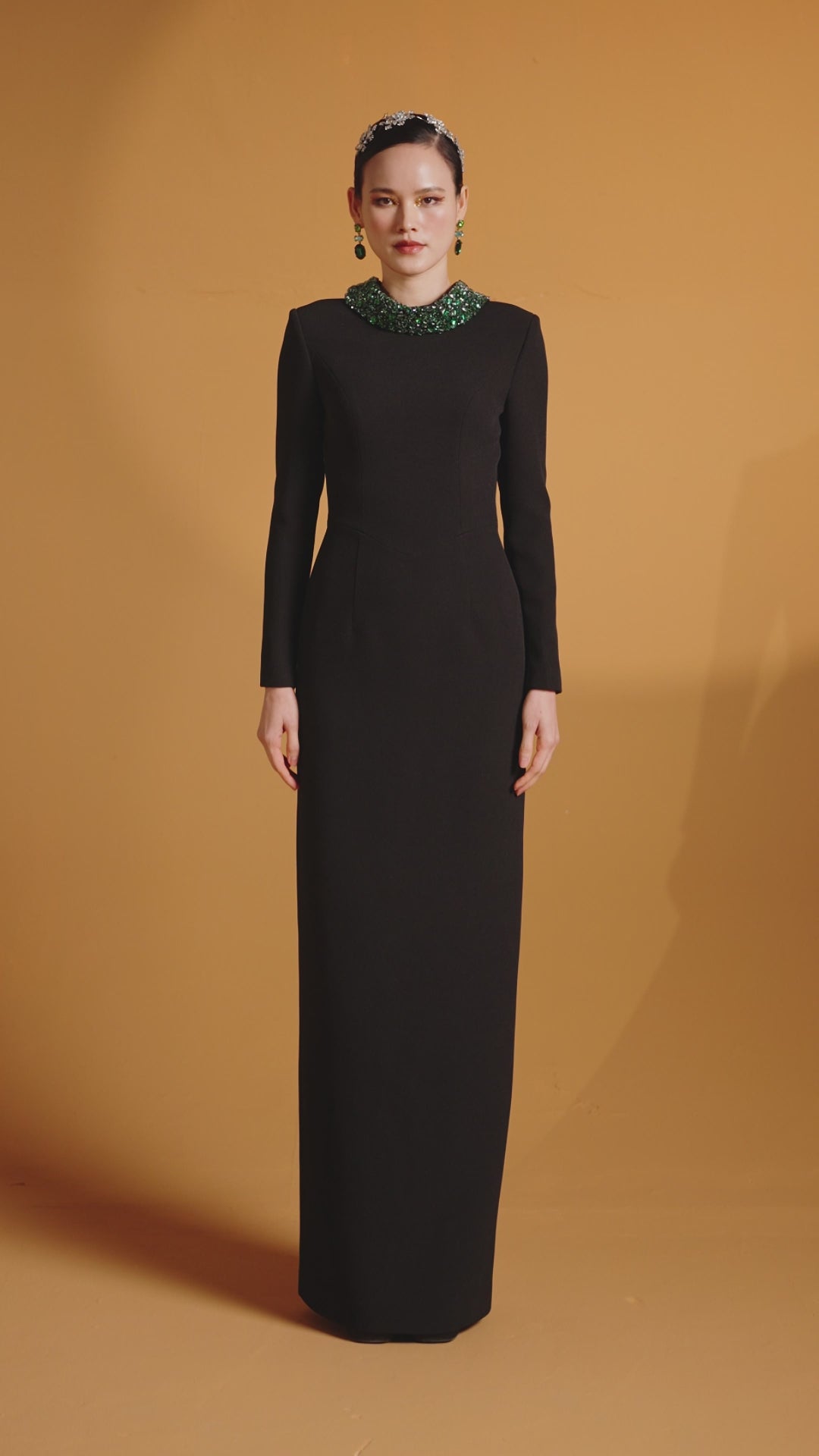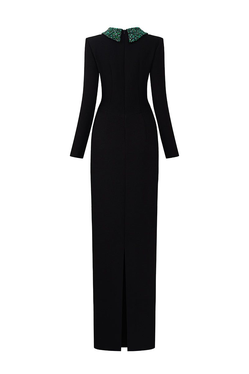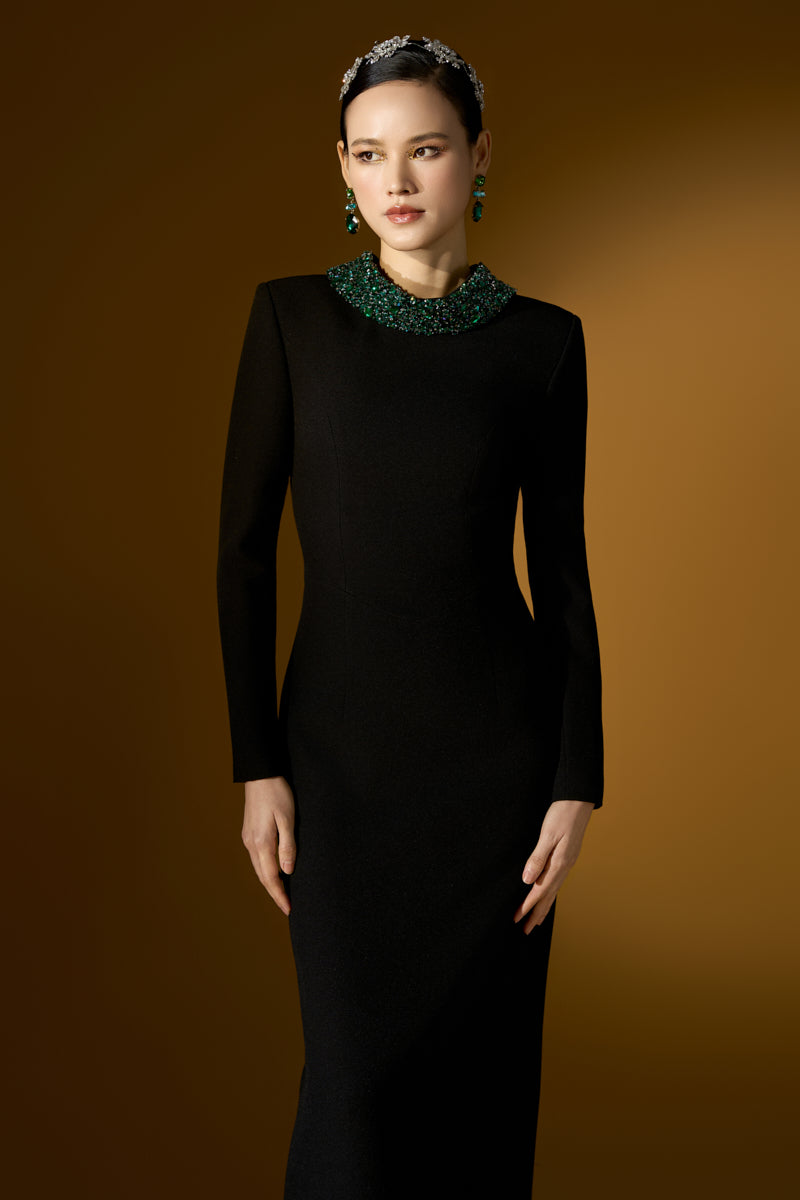 This Floor-Length Column Gown is a bold and luxurious statement piece. With its dramatic long sleeves and a deconstructed collar, the gown exudes both modern sophistication and artistic flair. Crystals and stones in varying colors are meticulously embellished throughout, adding an opulent touch of sparkle that draws the eye. Crafted from premium Scuba, the gown offers a sleek, flattering fit that gracefully follows the body's curves, making it a perfect choice for a high-profile event where elegance and boldness combine effortlessly.