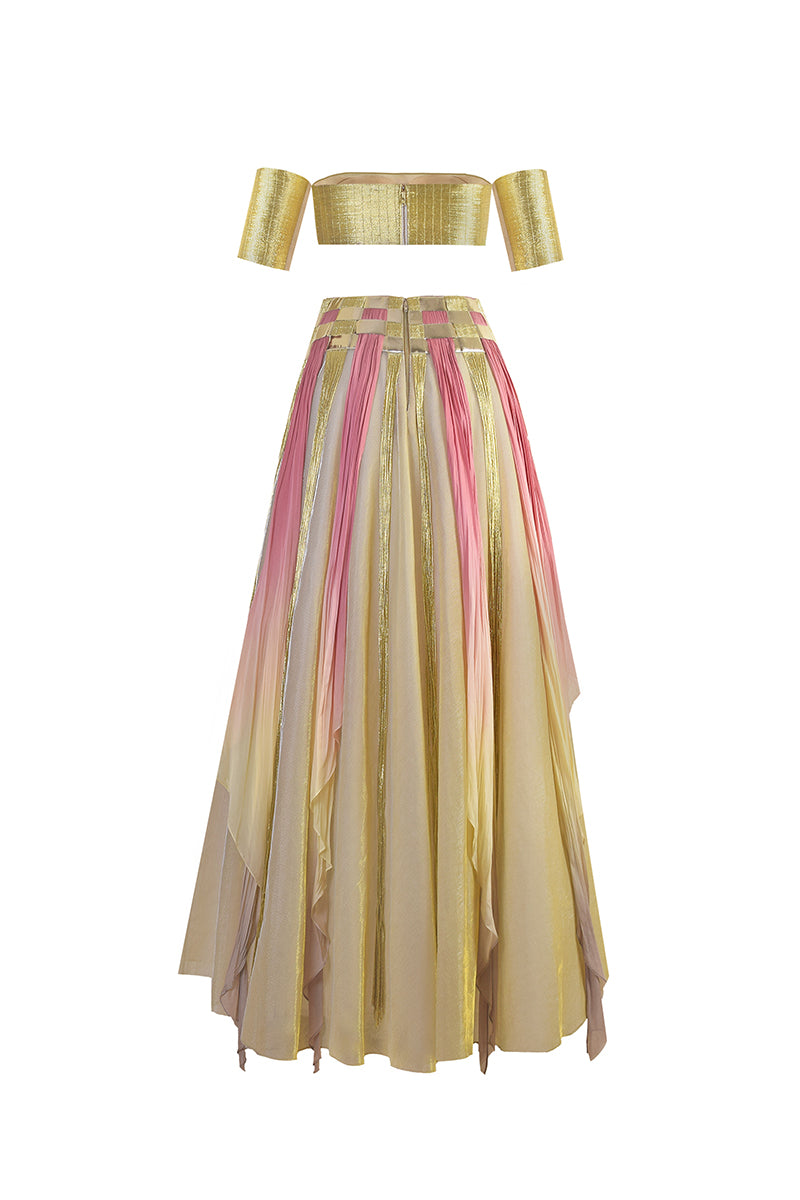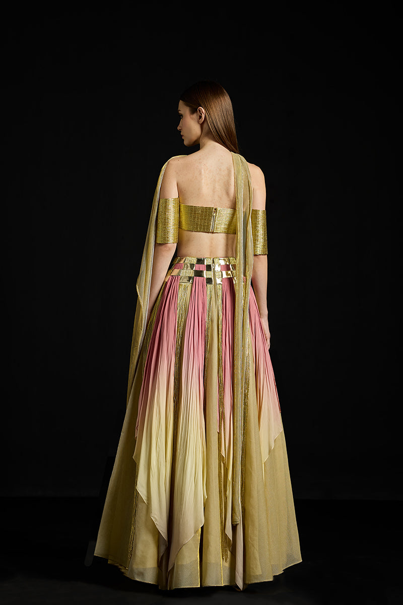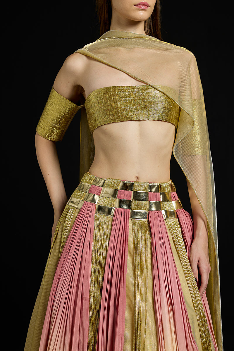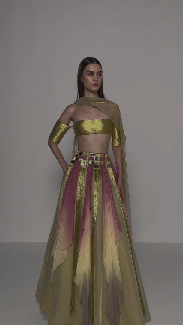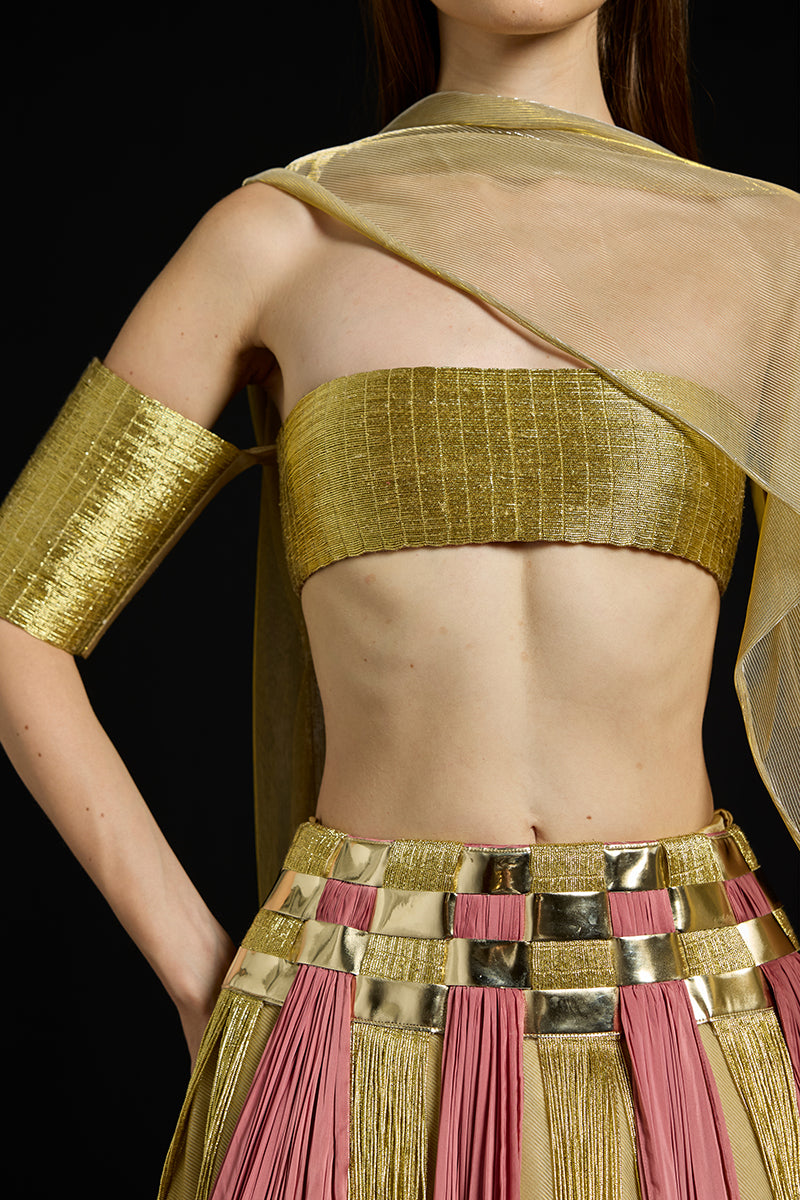 Composition: Chiffon (100% Viscose), Metallic-Tulle (70% Metallic Fibre 30% Polyamide), Hand-Spun Badla Doris (60% Badla 40% Cotton), Mirror Metallic trim (100% Polyester)