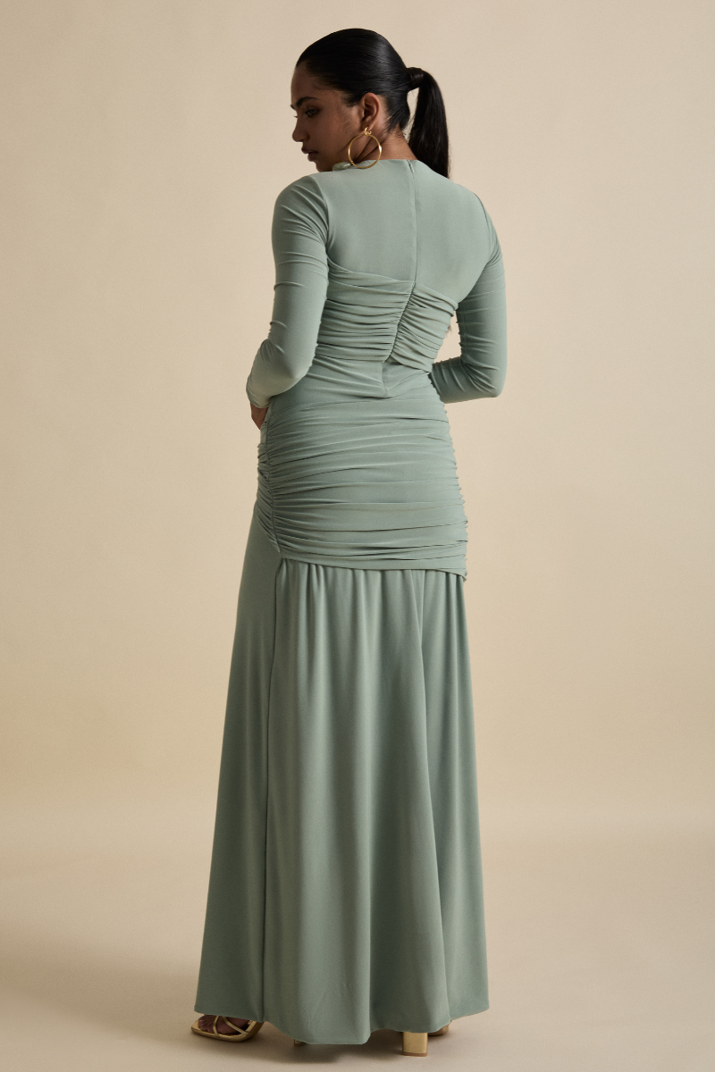 - The perfect modest piece with a long sleeve, high neckline and flowing skirt.