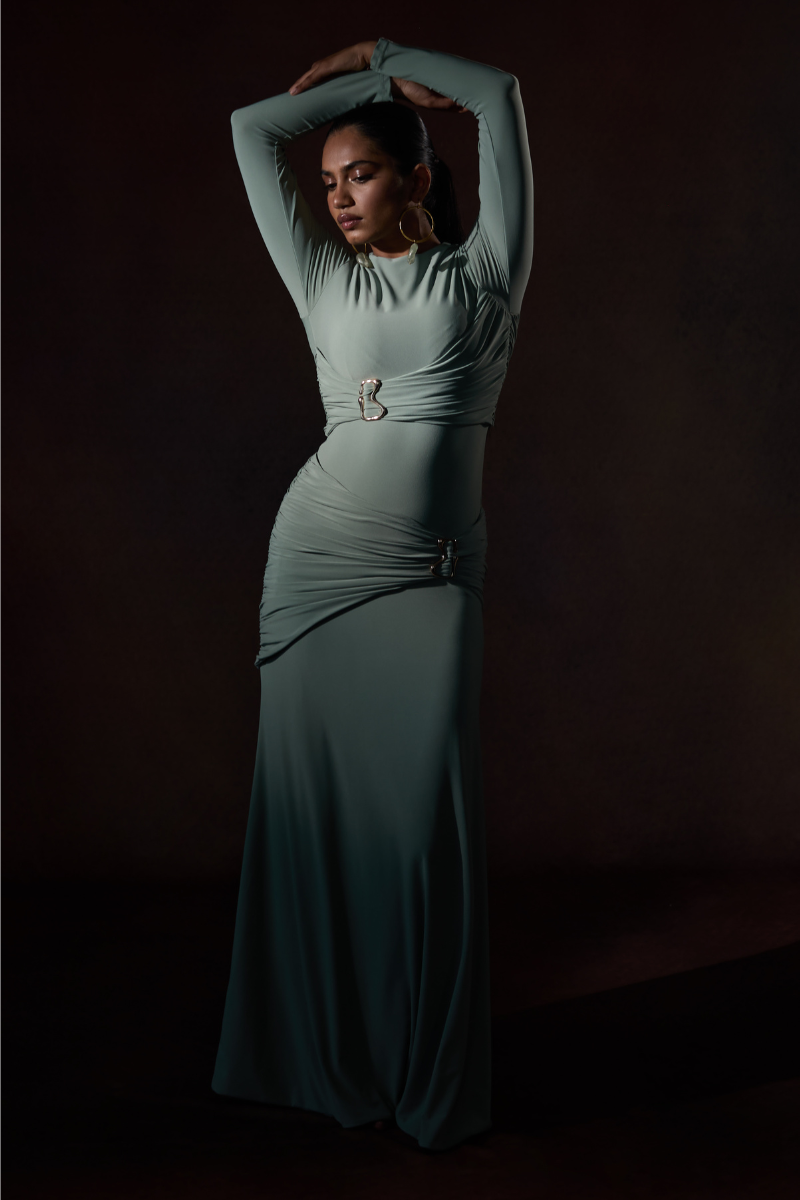 - Constructed in locally sourced, premium stretch drape jersey for defined luxury eveningwear.