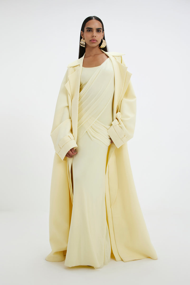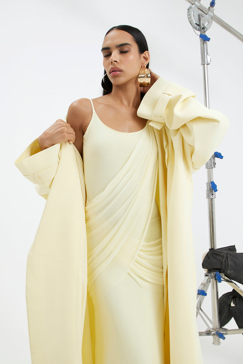 - This stretch malai slip dress hugs the body with an A-line silhouette, while sheer net drapes wrap around gracefully — adding layers of movement