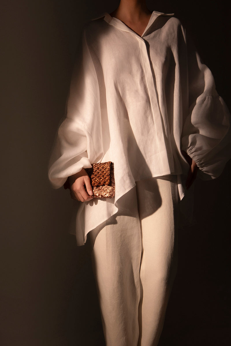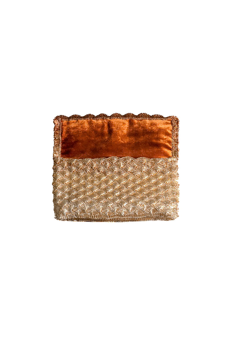 Hand-woven mochila that reinterprets our iconic silhouettes, infusing them with a distinctive weave and color play that symbolizes transition, rebirth, and hope. This clutch is crafted in copper and gold silver-plated metal threads with a copper velvet lining and a magnetic closure.