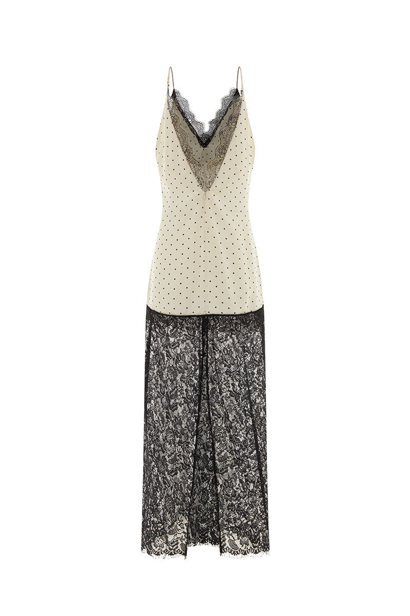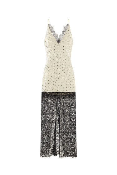 An elegant mini slip dress in a patterned with subtle, fine polka dots. The dress has delicate spaghetti straps and a flattering V-neckline beautifully accented with contrasting black lace trim. Layered beneath the slip is a dramatic floor-length skirt made entirely of intricate black floral lace, providing an ethereal, sheer contrast to the solid top.