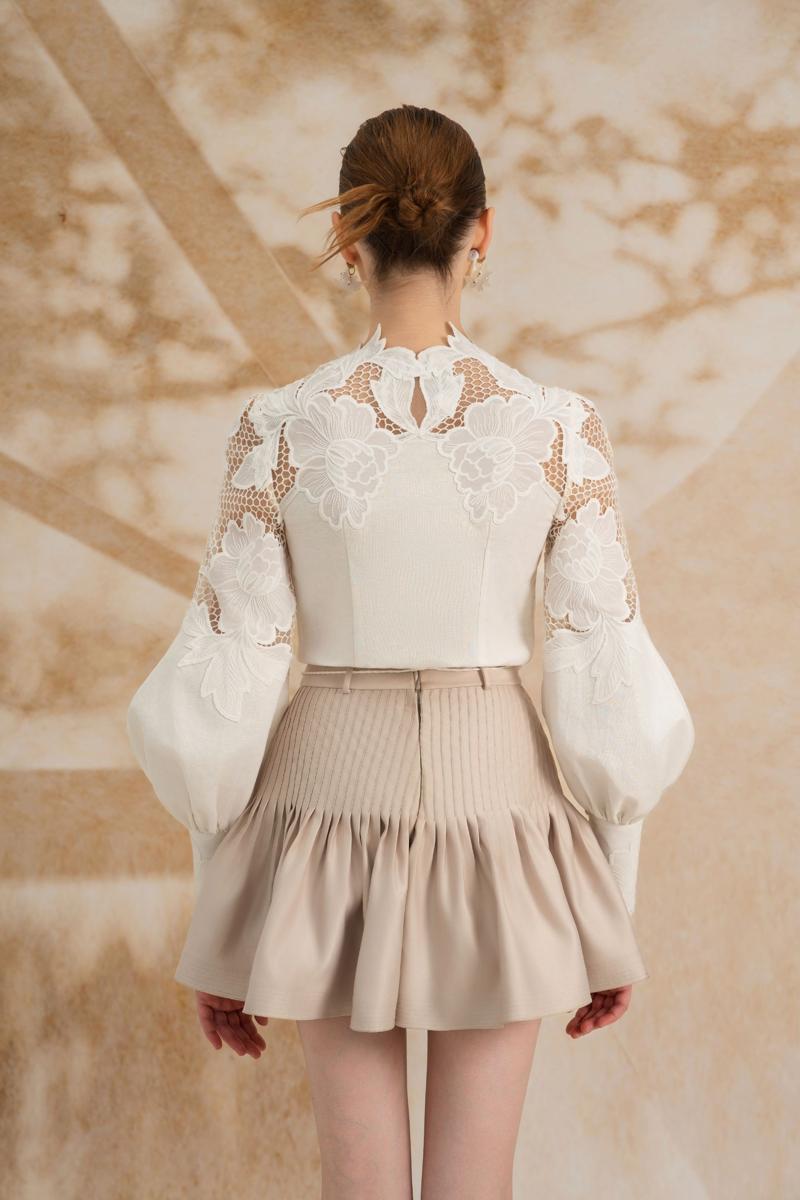 - Material: Shirt: Lace mixed with Linen, Skirt: Satin Silk