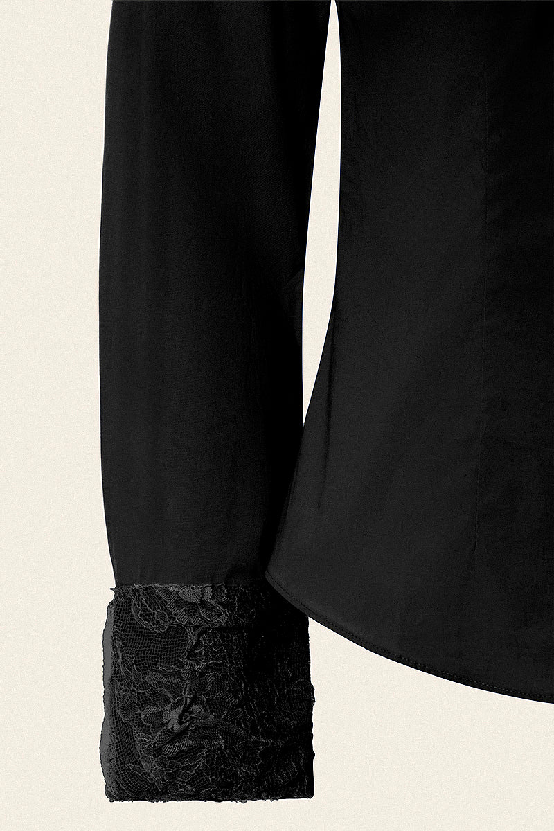 Cotton fitted shirt in midnight black featuring lace trims in black around sleeves and collar.