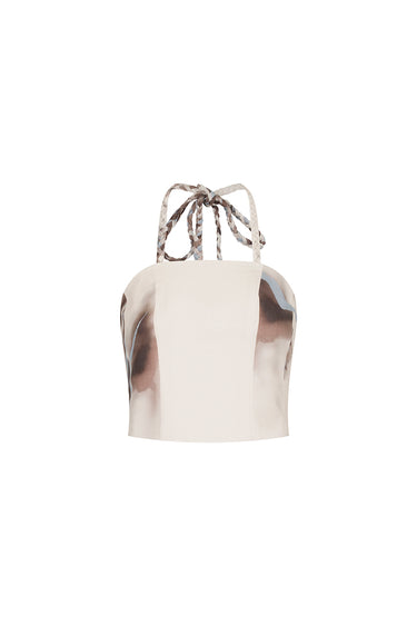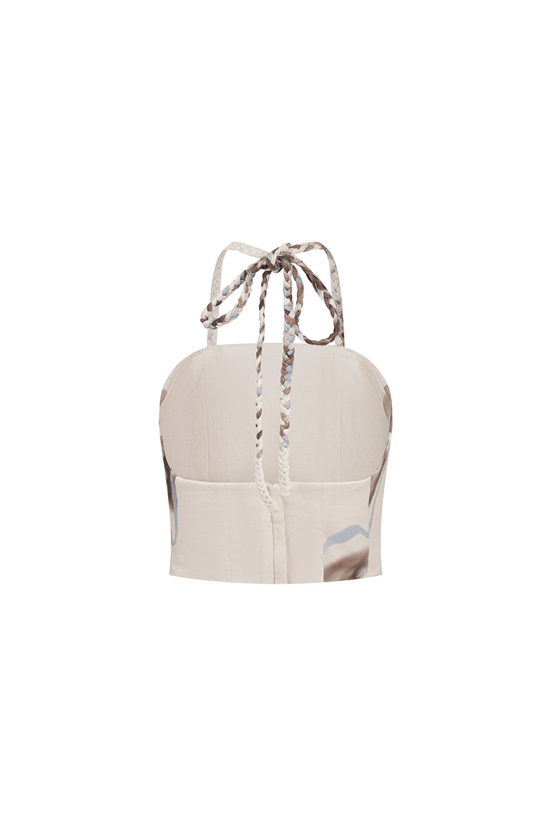 This halter top with a straight neckline and braided straps that tie at the back. Designed with a fitted bodice and an open back, it balances structure with fluidity.