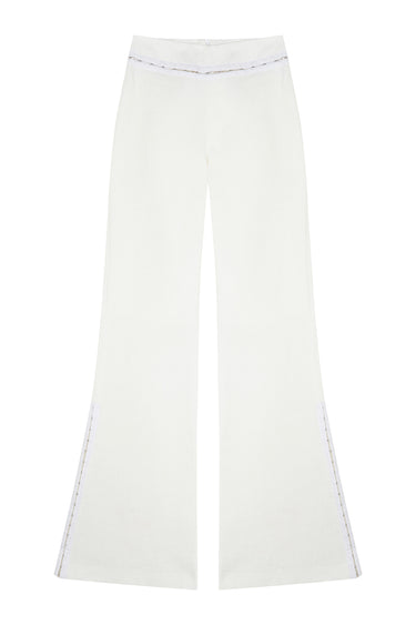 - High-waisted flared pants with waistband fastened by hooks and side slits adjustable with hooks