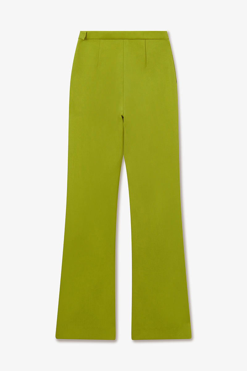 The LIZA is a mini flare tailored trouser in palm green bonded twill with narrow waistband, slant pockets, and side zip closure.