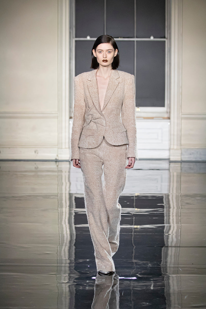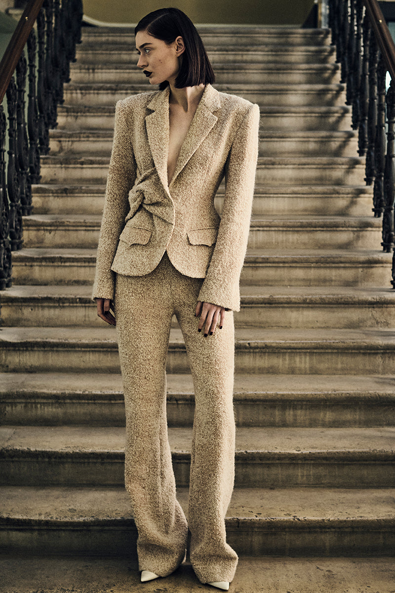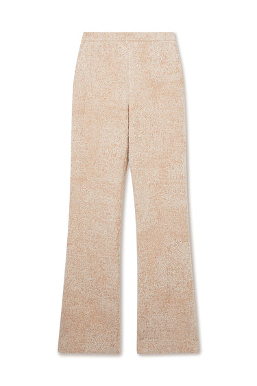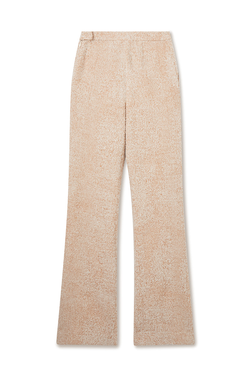 The LIZA is a mini flare tailored trouser in ivory-caramel textured tweed with a narrow waistband, slant pockets and side zip closure.