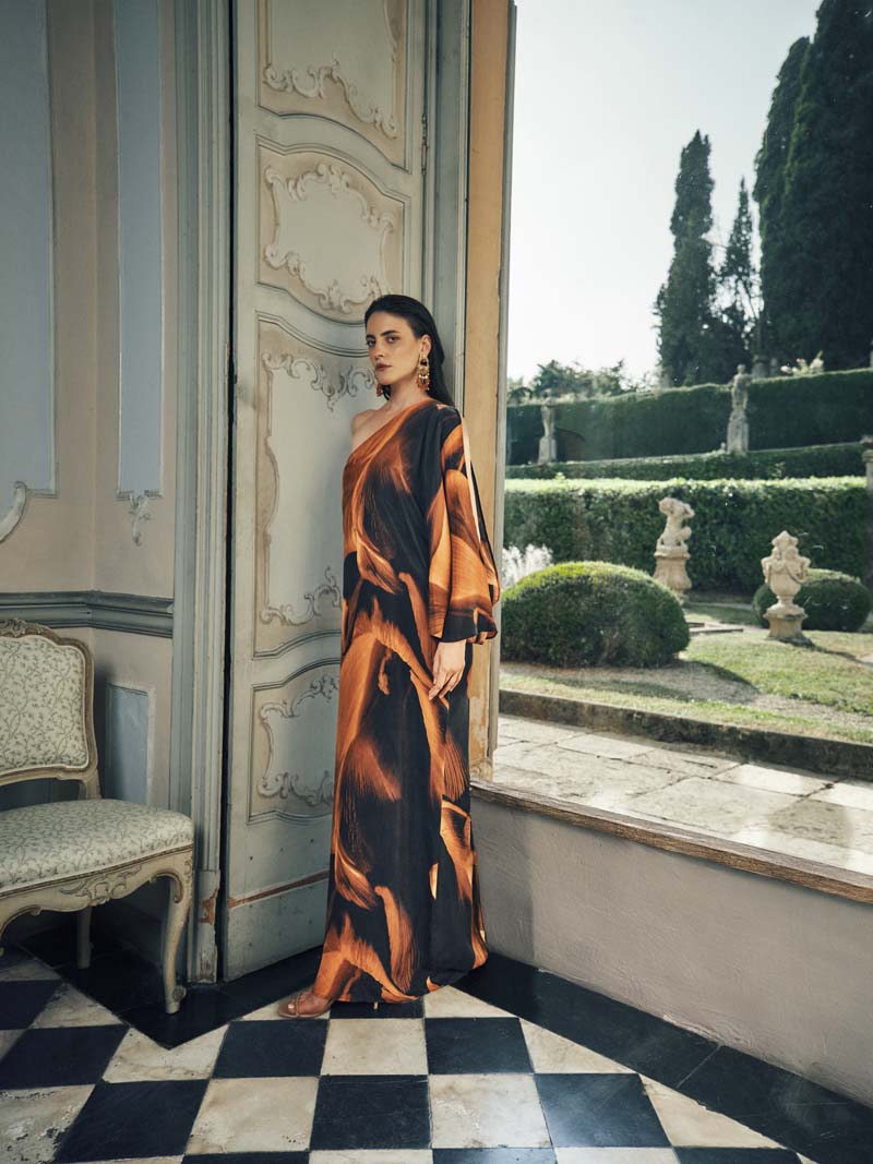 The dress is made made more captivating by its glorious print. The Loren Print, inspired by the iconic Sophia Loren, reflects her more sophisticated and cool charm. With its unique abstract strokes of Sienna, Loren embodies the cinematic appeal of 1970s St. Tropez, conveying an understated confidence that envelopes the wearer.
