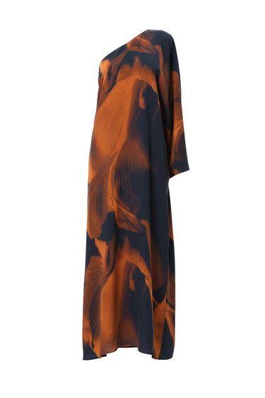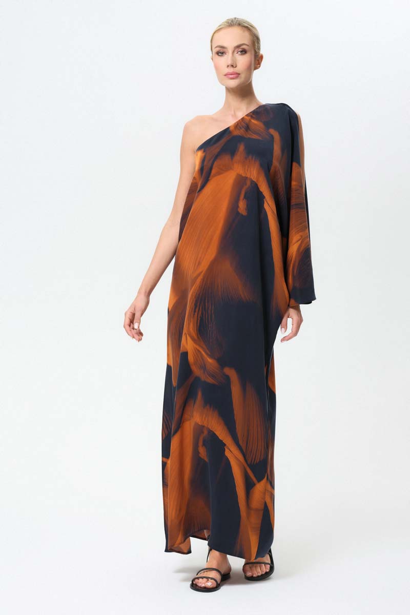 A captivating take on relaxed elegance, the Calypso One Shoulder Dress is crafted with mindful minimalism embracing your inner goddess. This asymmetric maxi has a long one-shouldered draped slit sleeve as well as an elegant side seam opening that reveals part of the leg.