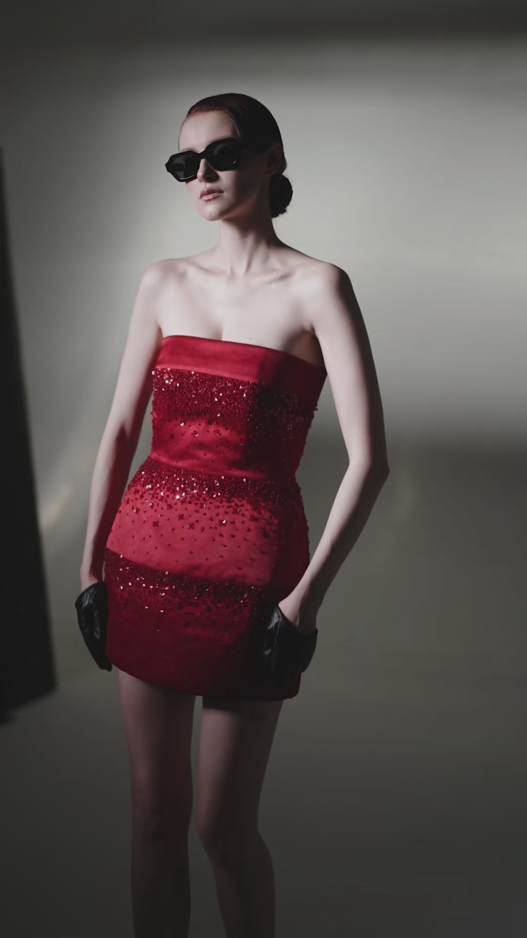 Fiercely modern and unapologetically confident, this Strapless Mini Column Dress is a bold statement of empowered femininity. Tailored from structured silk taffeta, the clean, sculptural lines of the silhouette are enriched with radiant sequin embellishments that contour the body with light and texture. A minimalist design with maximal impact.