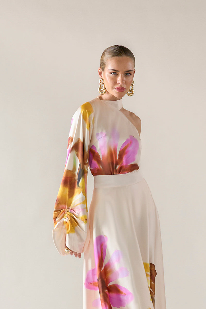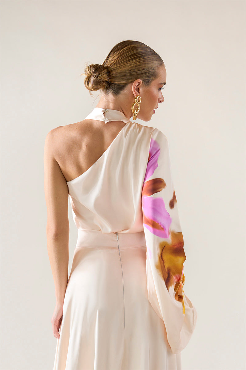This blouse with an asymmetric one-shoulder silhouette. The design features a voluminous long sleeve with gathered detailing, balancing fluid drape and sculptural shape.