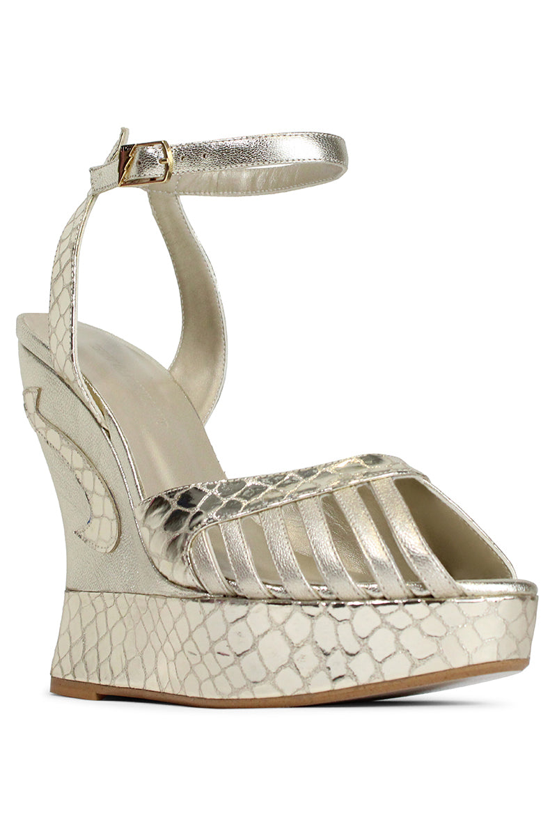 - With a 14cm wedge and 3cm platform, the Margaux Gold gives you all the height with none of the discomfort.