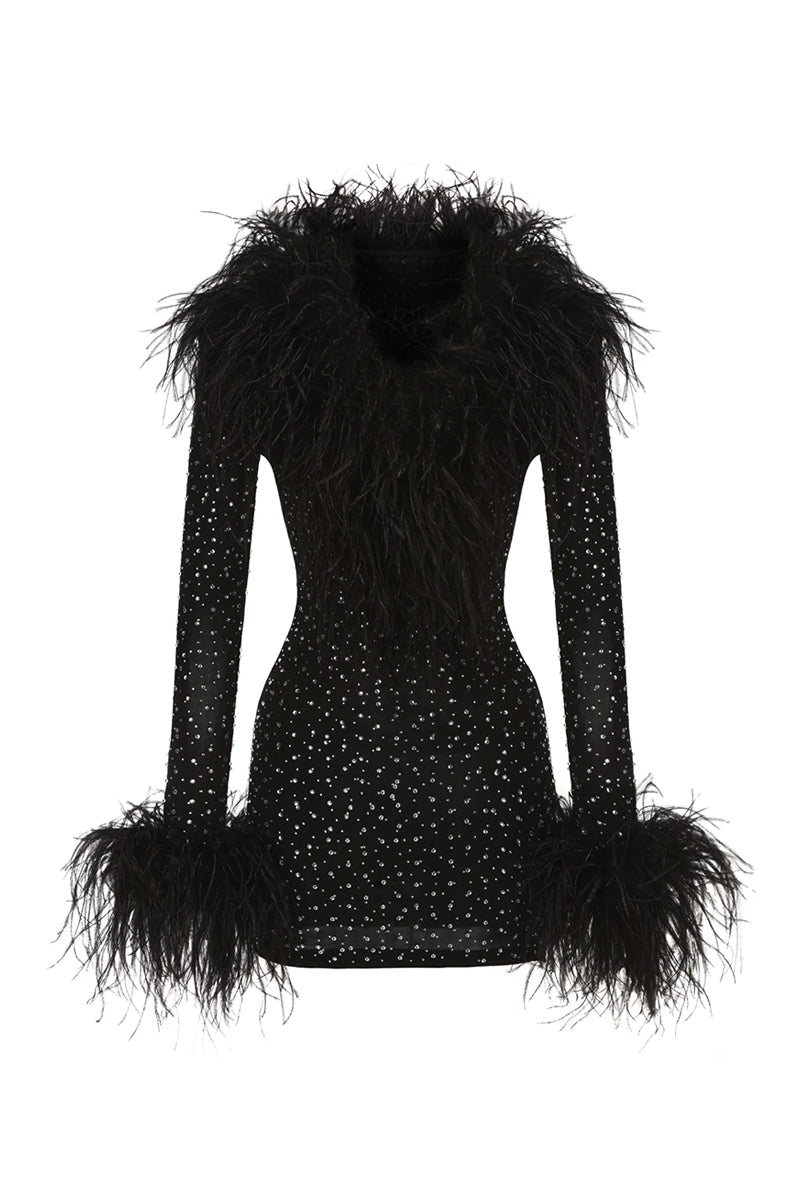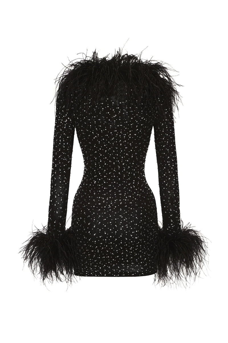 - Long sleeves with ostrich feather trim