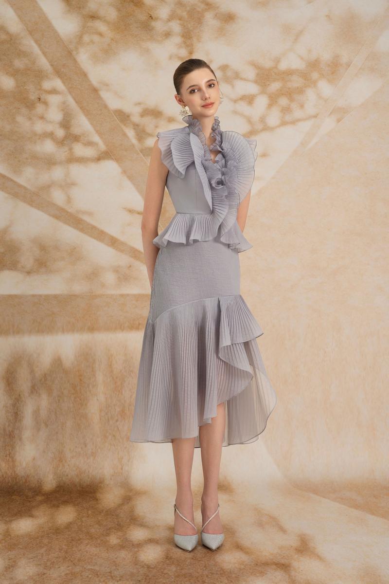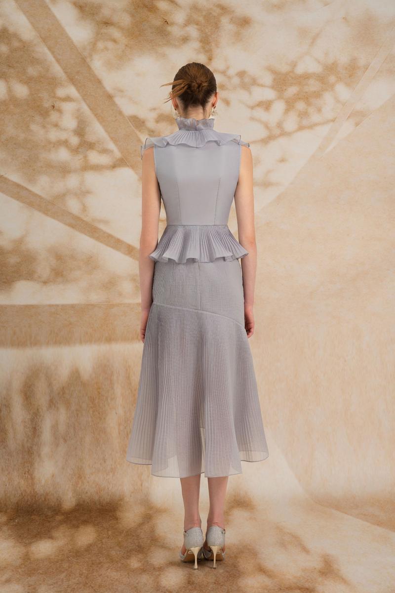 - Pleated, tied at the waist and flared from waist to belly