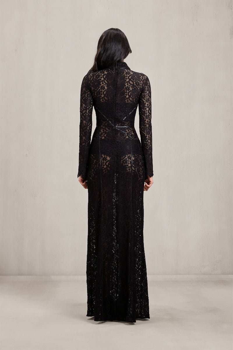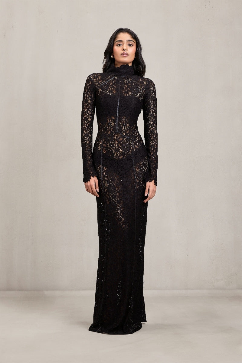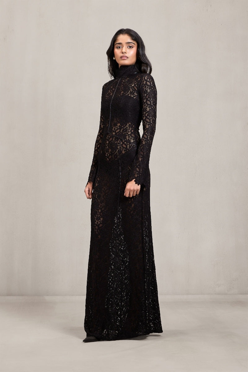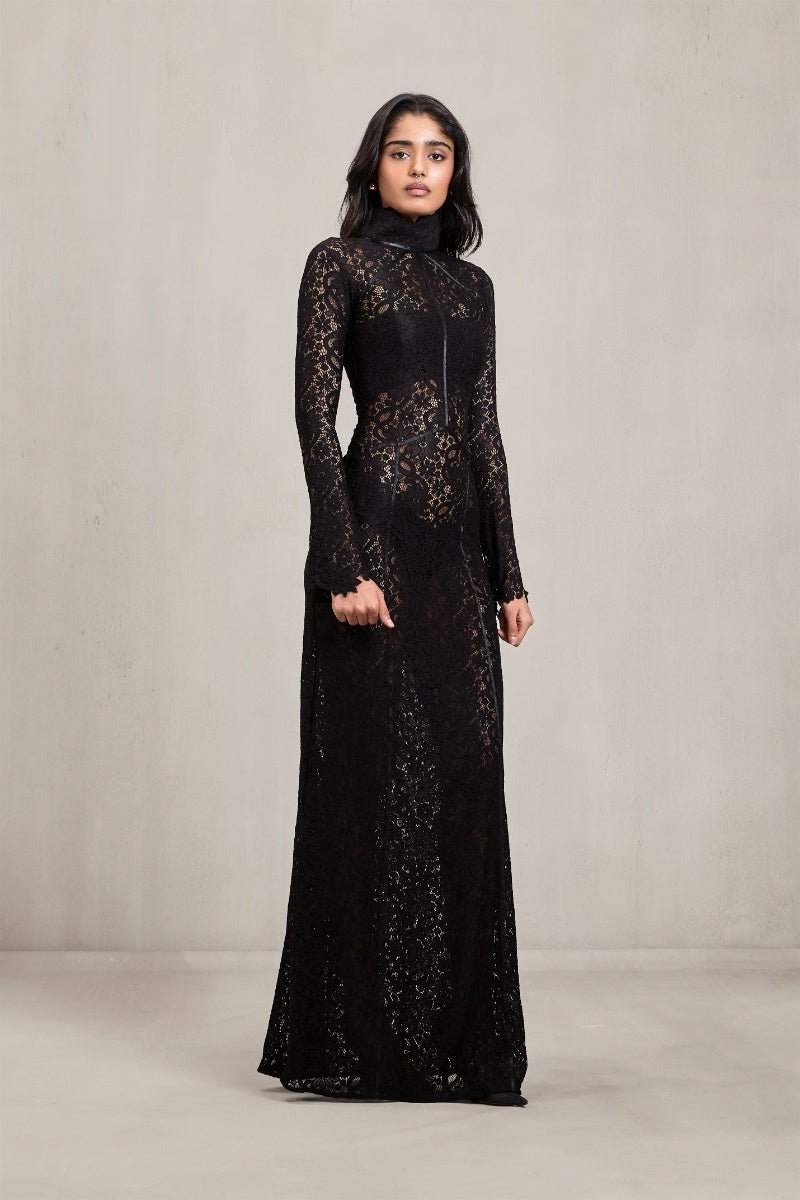 A fully paneled lace gown with delicate silk patti detailing, contouring the body into an elegant straight drape for a timeless.