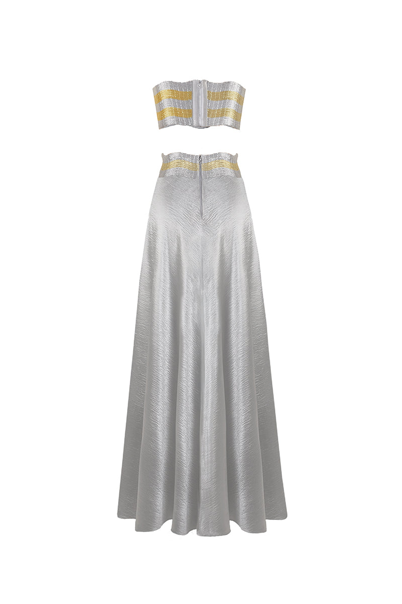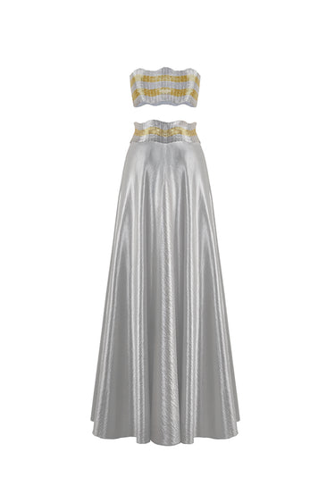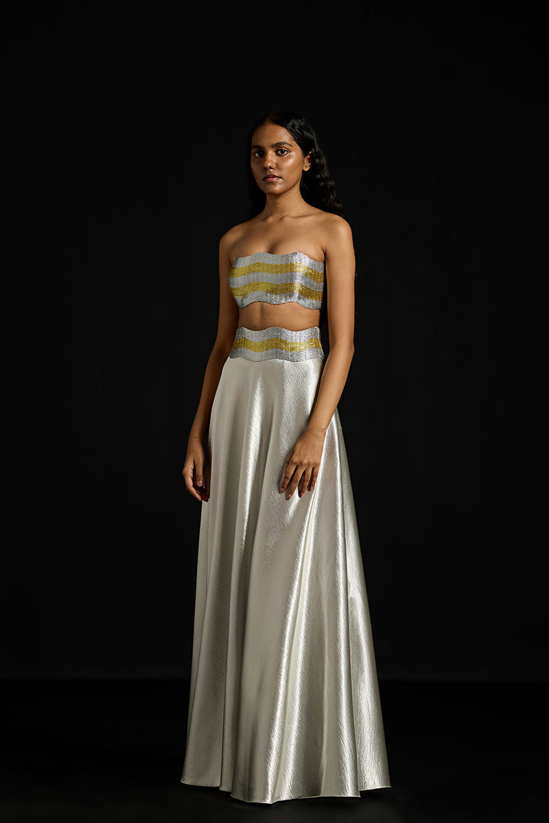 - Textured Satin skirt with wave hand-embroidered metallic yarns waistband
