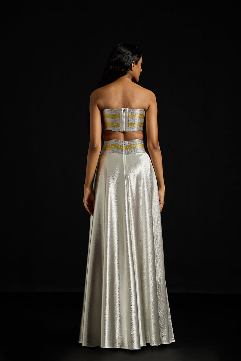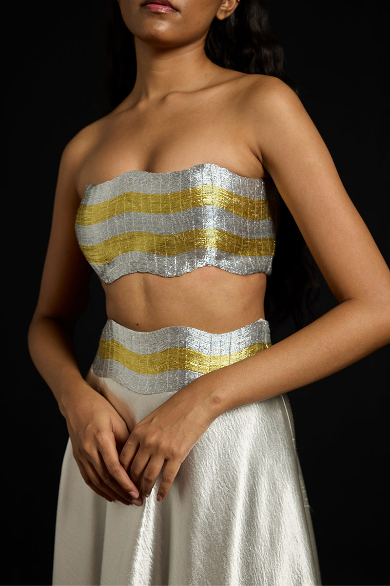 - Metallic wave structured bustier crafted with hand-embroidered metallic yarns
