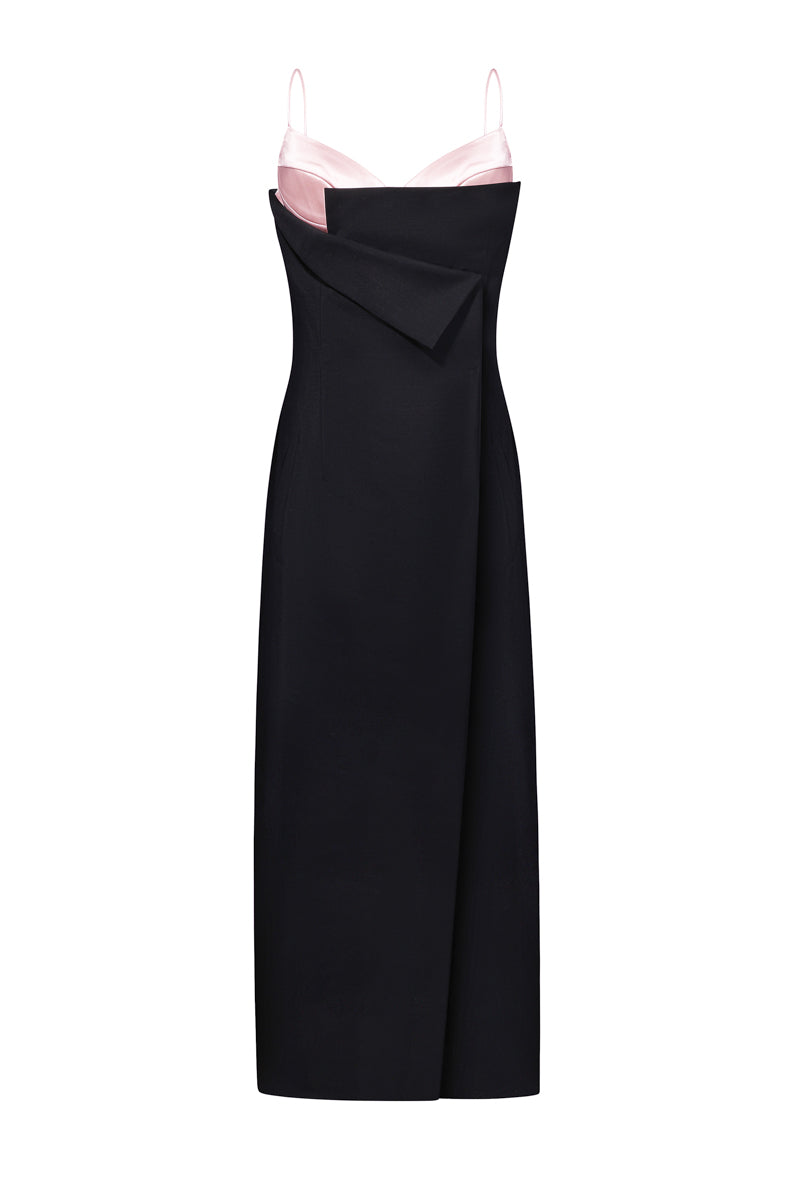midi dress with visible pink satin bustier