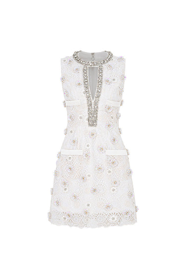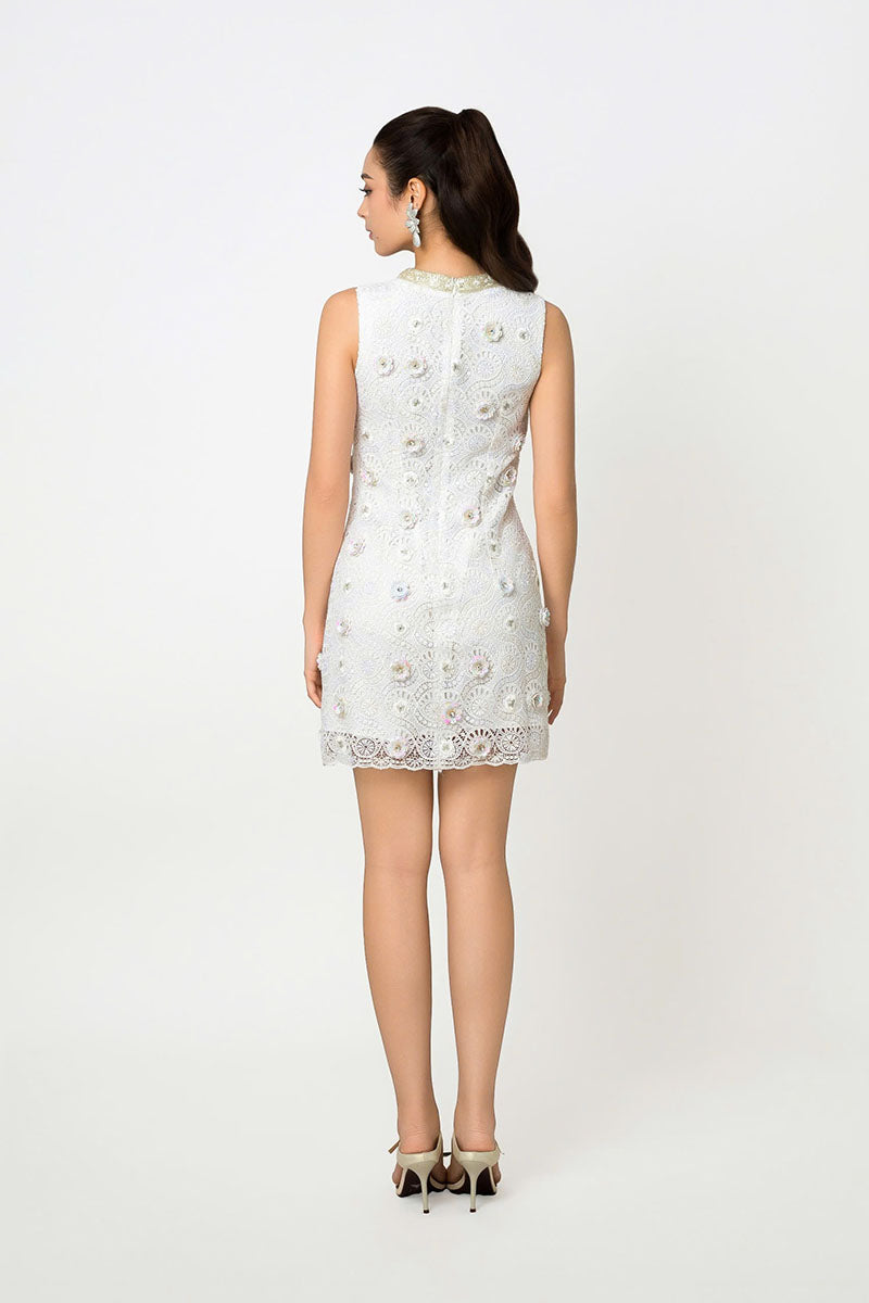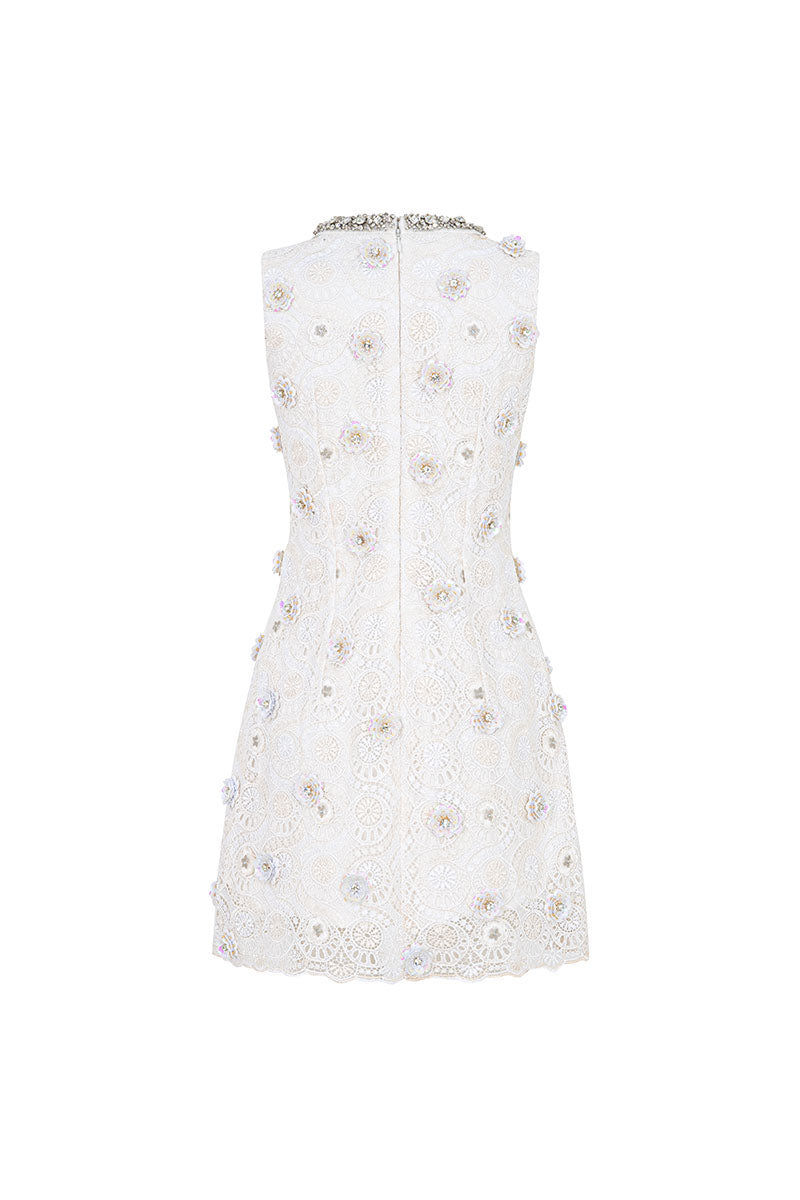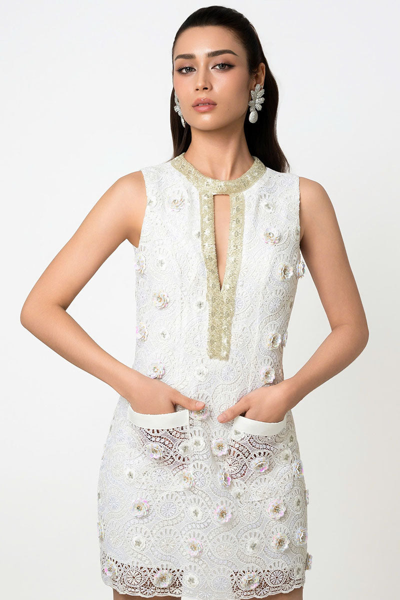 This exquisite mini-length dress boasts a sleek, structured shift silhouette, offering a chic and tailored fit. Constructed from intricate lace, the garment is richly embellished with three-dimensional floral appliqué and delicate beading. It features a refined high jewel neckline with an elegant keyhole detail and is completely sleeveless, making it a stunning statement piece.