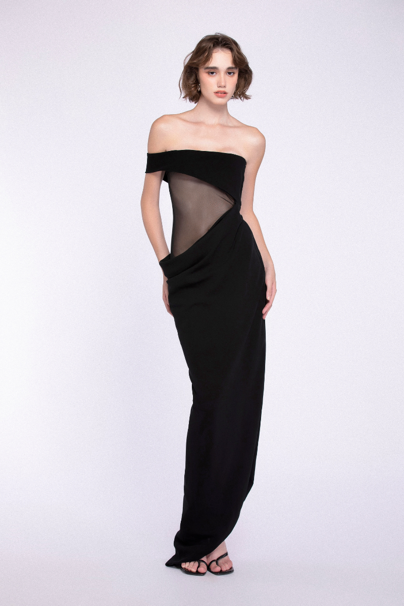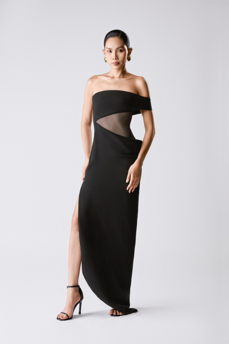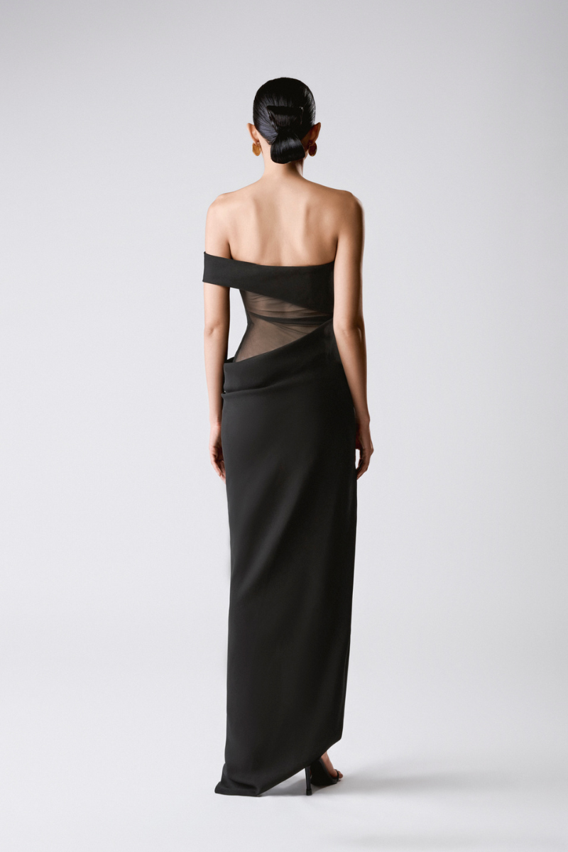 A minimal yet sharp off-shoulder gown, crafted from premium stretch crepe that contours the body while maintaining structure.