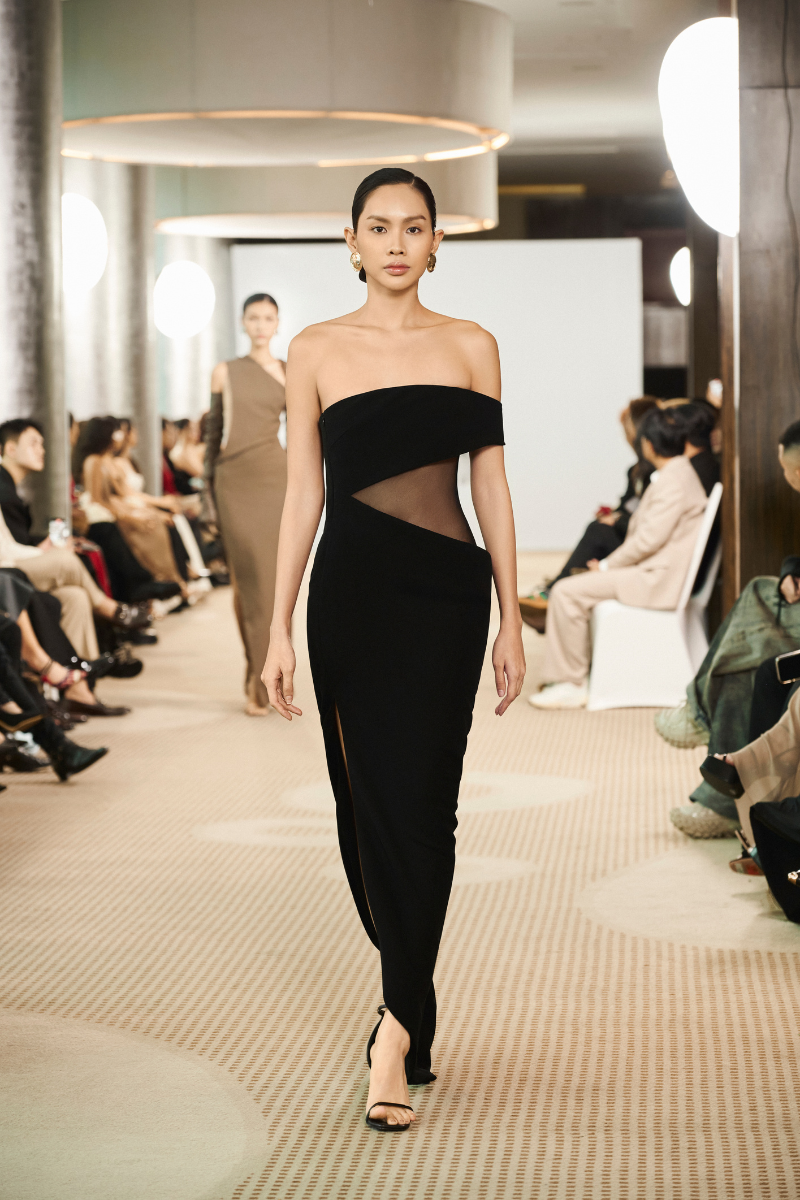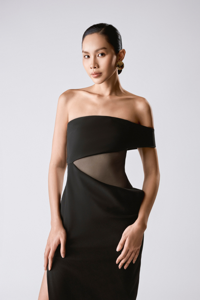 Executed with clean tailoring and precision-cut sheer placement, the gown balances understated elegance with modern sensuality.