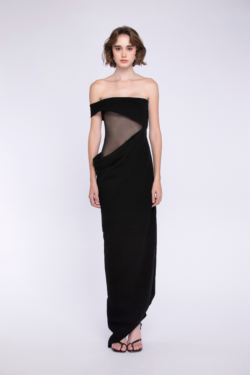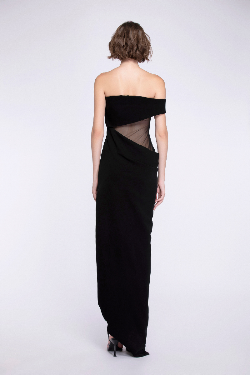 The semi-sheer mesh panel at the waist adds a sensual contrast, while the asymmetrical lines and front slit elongate the silhouette.