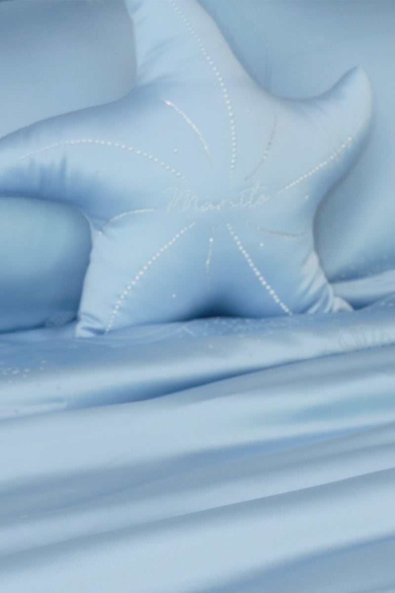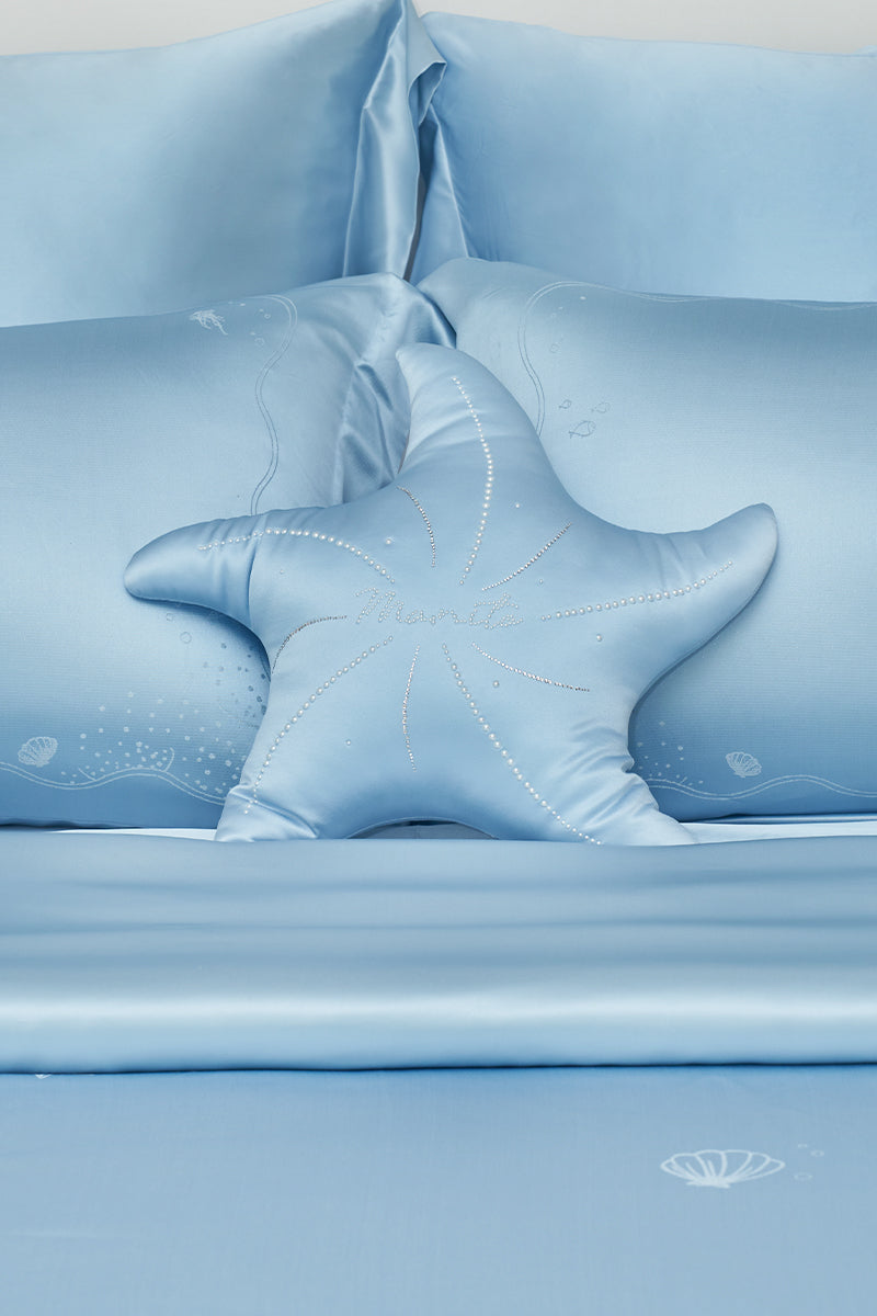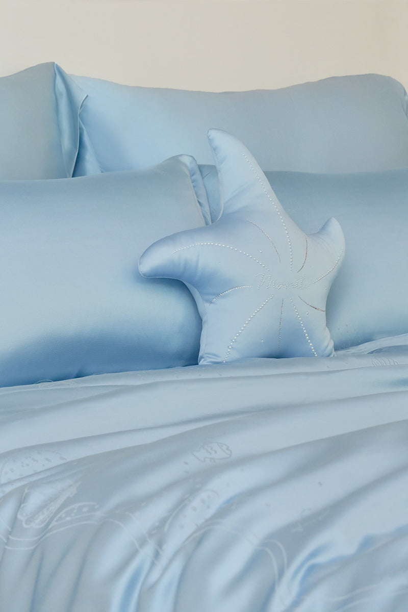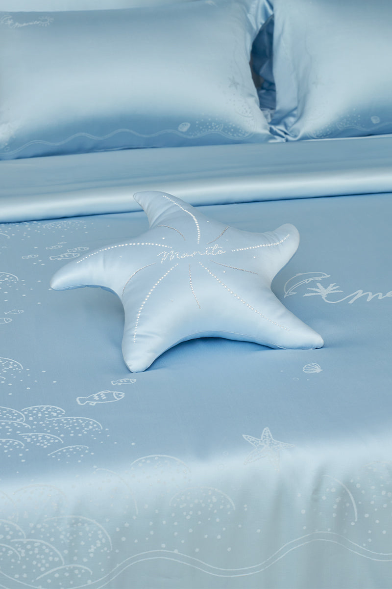 The Ocean Starfish Pillow takes inspiration from sunlit coastlines with its starfish-shaped design, sparkling Swarovski crystals mimic glistening ocean waves, adding a touch of radiant elegance. Crafted from 22 momme mulberry silk, its texture as gentle as a breeze caressing the skin. Transforming home corners into a whimsical haven where marine magic meets luxurious comfort.