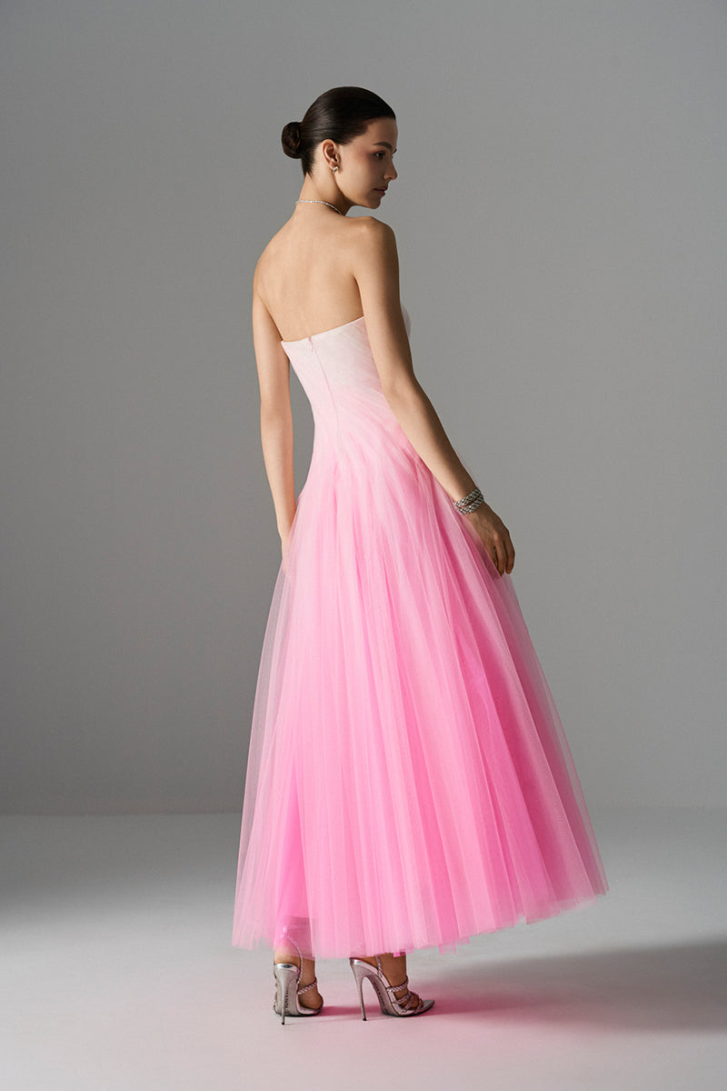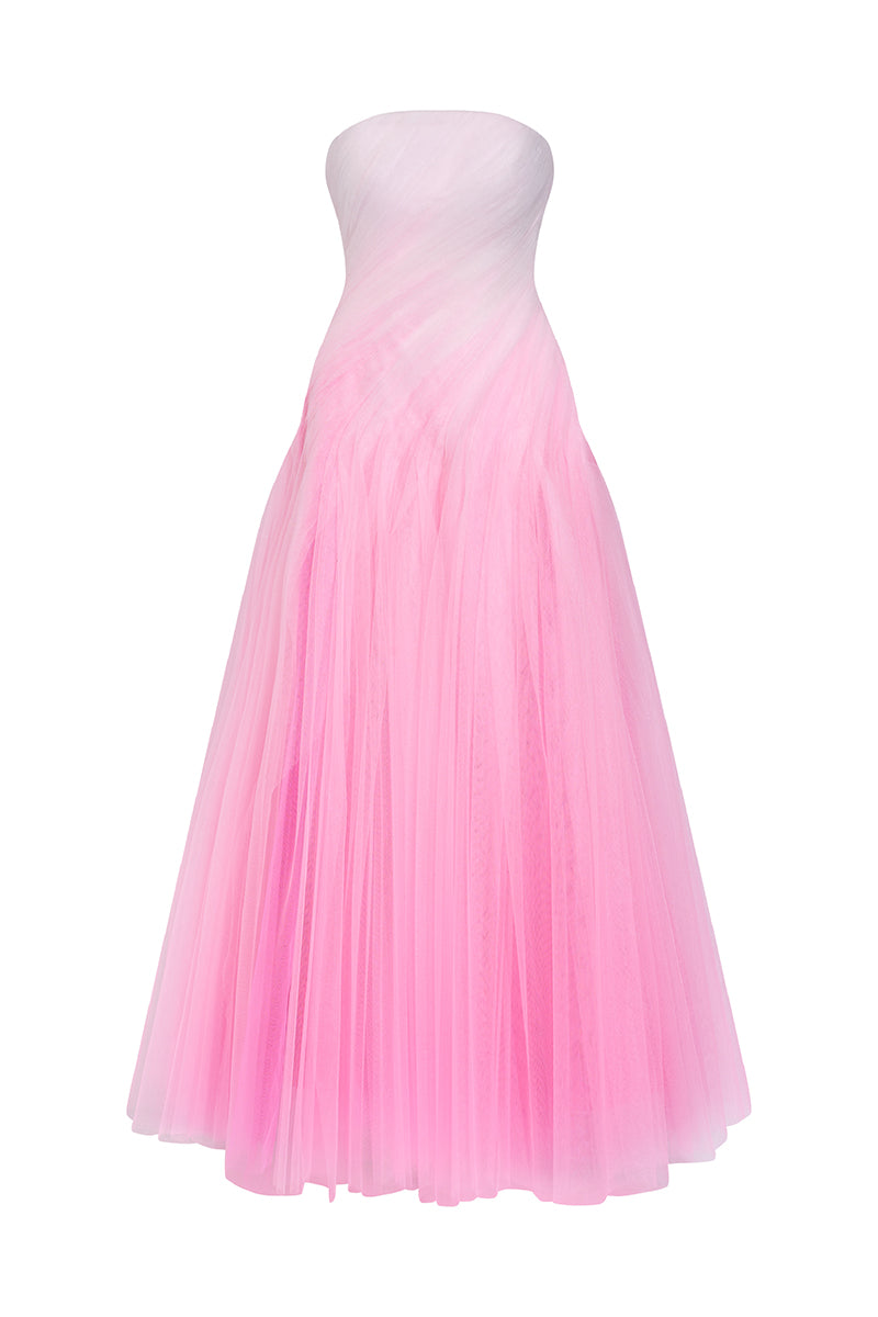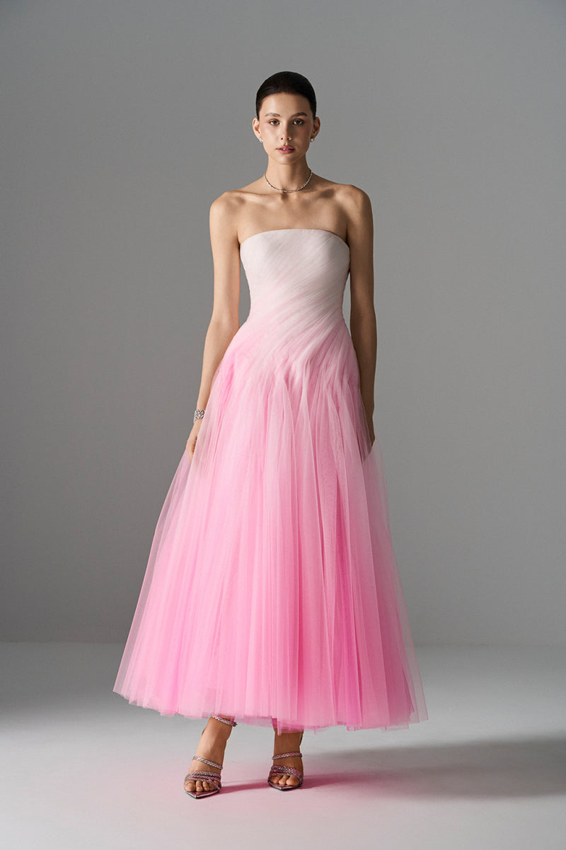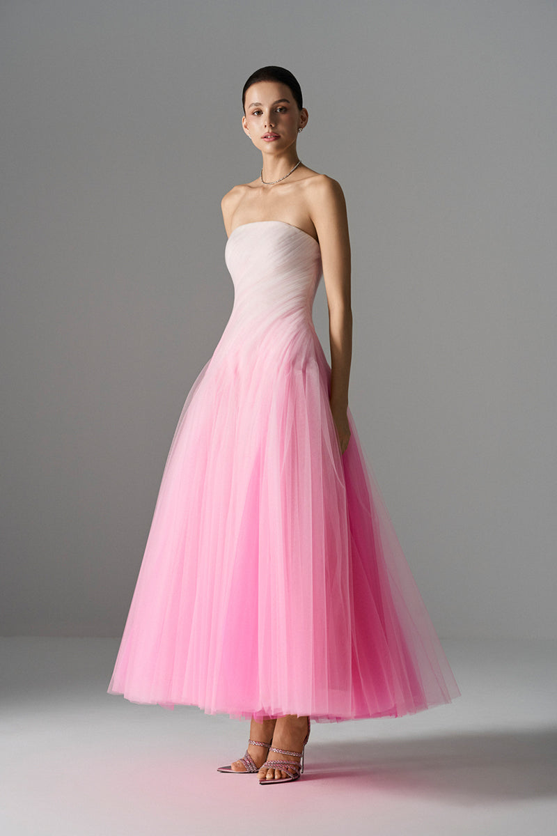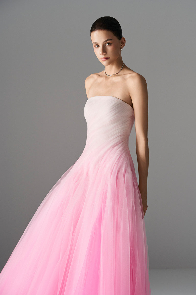 - The bodice showcases diagonal ruching and draping that sculpts the waist