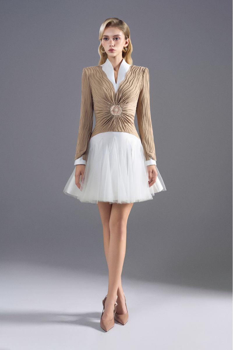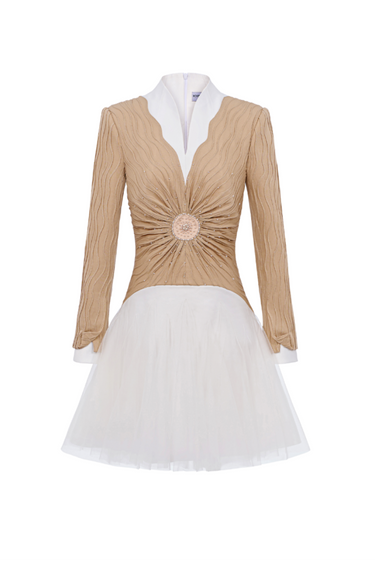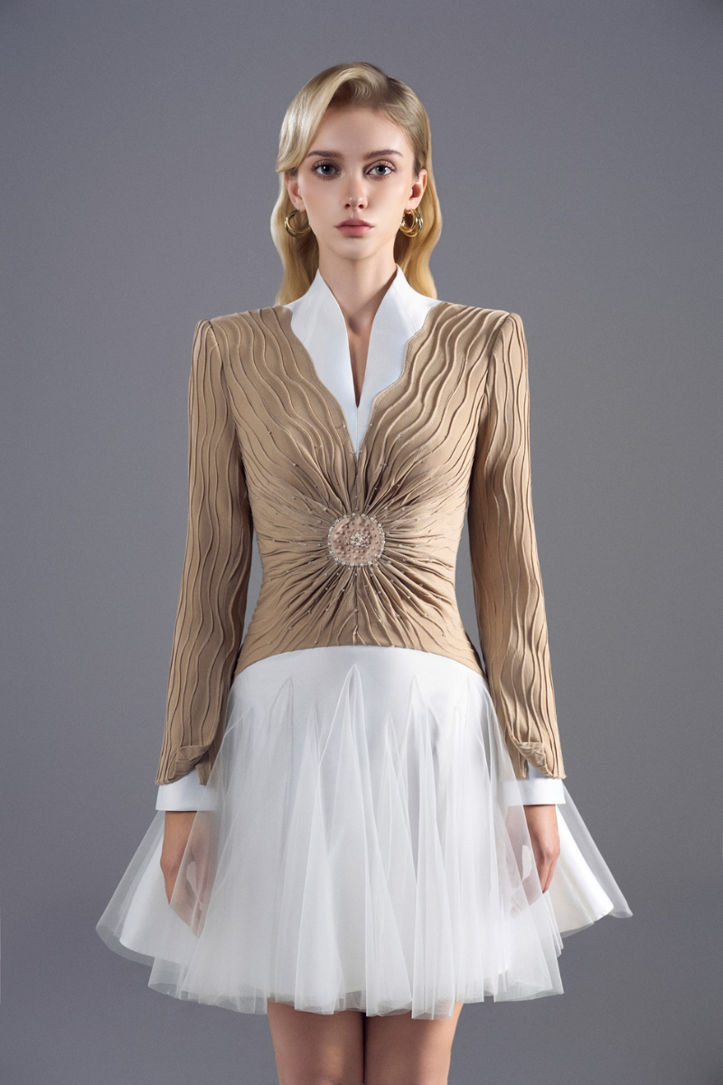 Composition: Wave knit fabric combined with white taffeta and white mesh