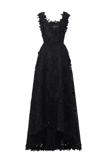 The Floral Garden Lace Trapeze Midi Mullet A-line Dress brings airy elegance to a sculpted floral silhouette. Crafted from intricate garden inspired lace, the dress flows effortlessly from a gentle A-line into a soft mullet hem that adds movement and lightness. Delicate pearl cluster embellishments glisten across the lace, infusing the design with refined luminosity - a perfect harmony of texture, grace, and modern romance.