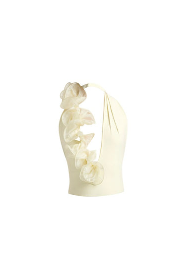 This chic deep V-neck halter top features a low back design and is accented with asymmetric organza flowers along the neckline.