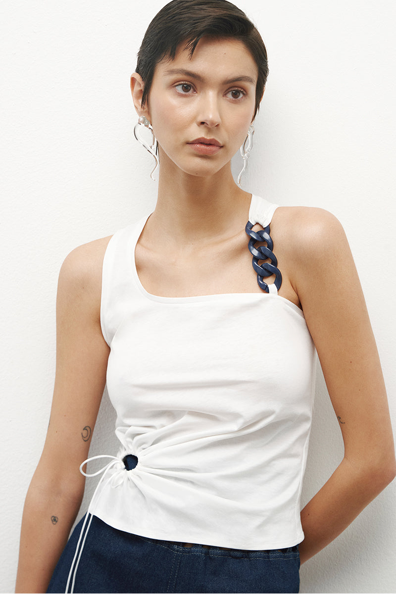 - Wide-strap top with chain detail on the shoulder and front side cut-out with gathered detail