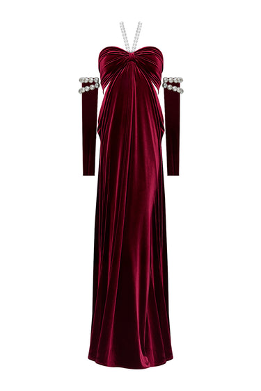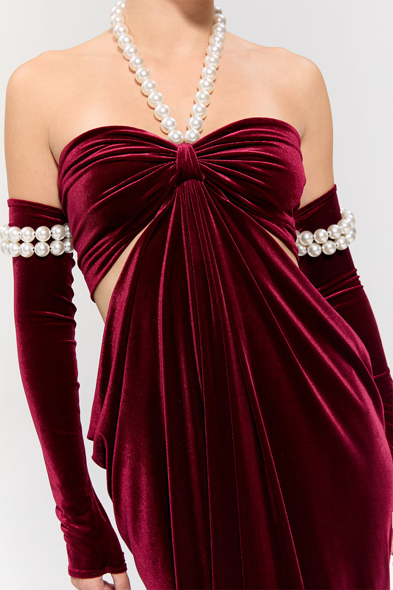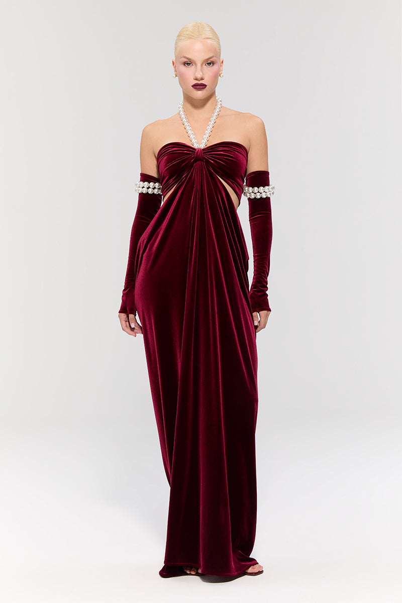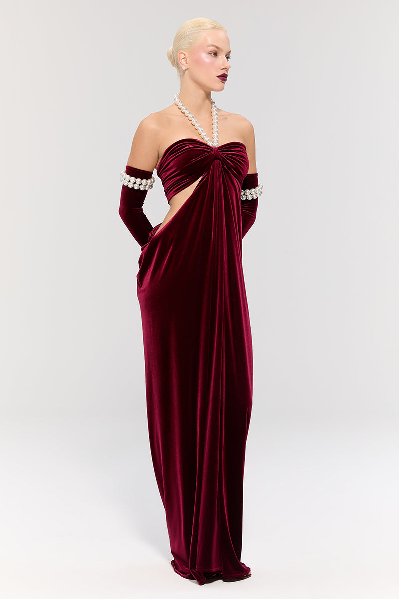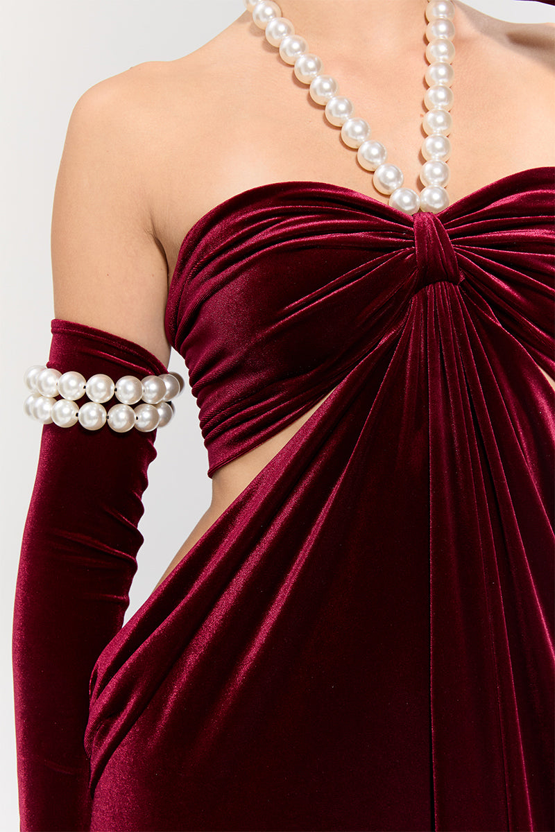 - The burgundy velvet dress offers a sophisticated look, featuring side cut-outs and a pearl neck tie for an elegant touch