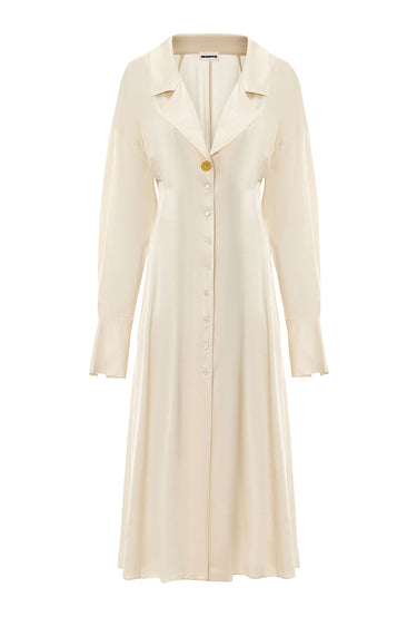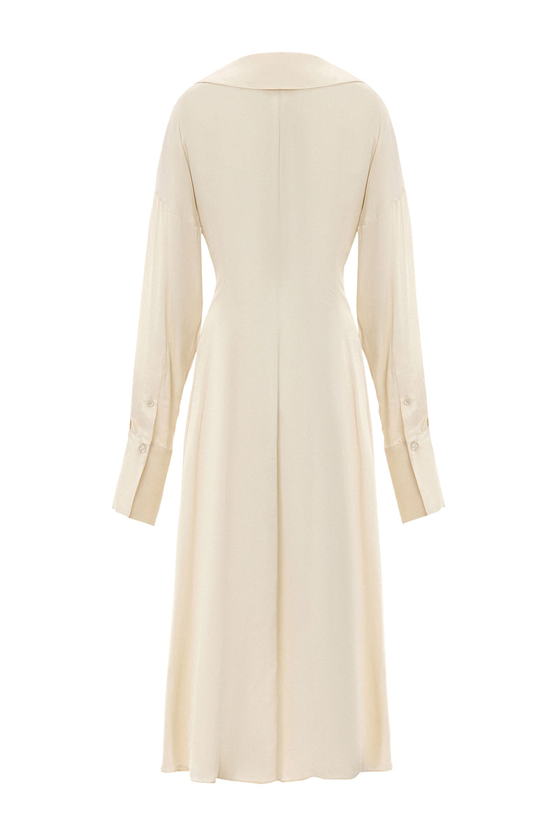 Flowy shirt dress in cream featuring wide collars custom-made gold-platted silver button detail gathered long sleeves and fitted waistline.