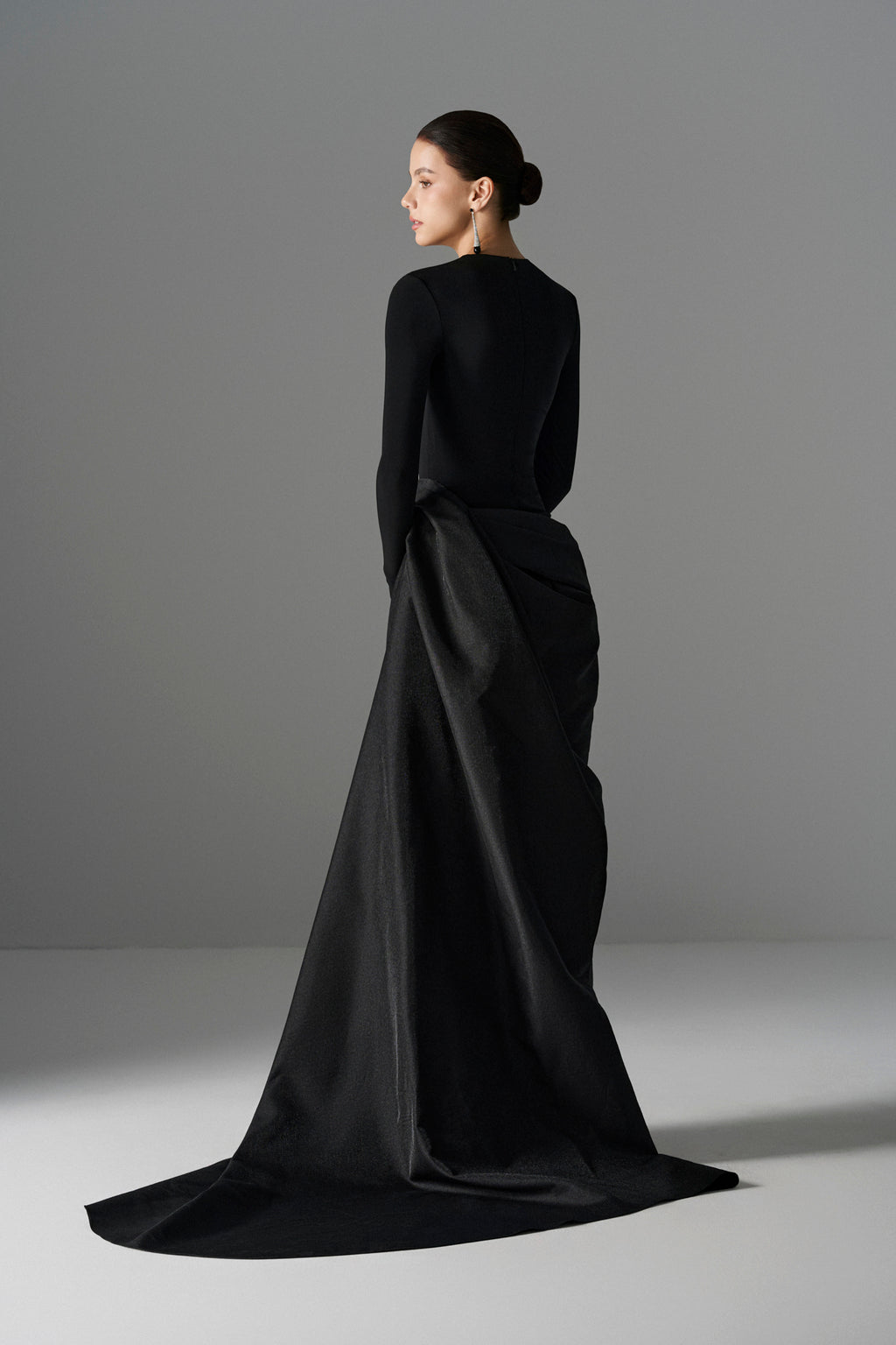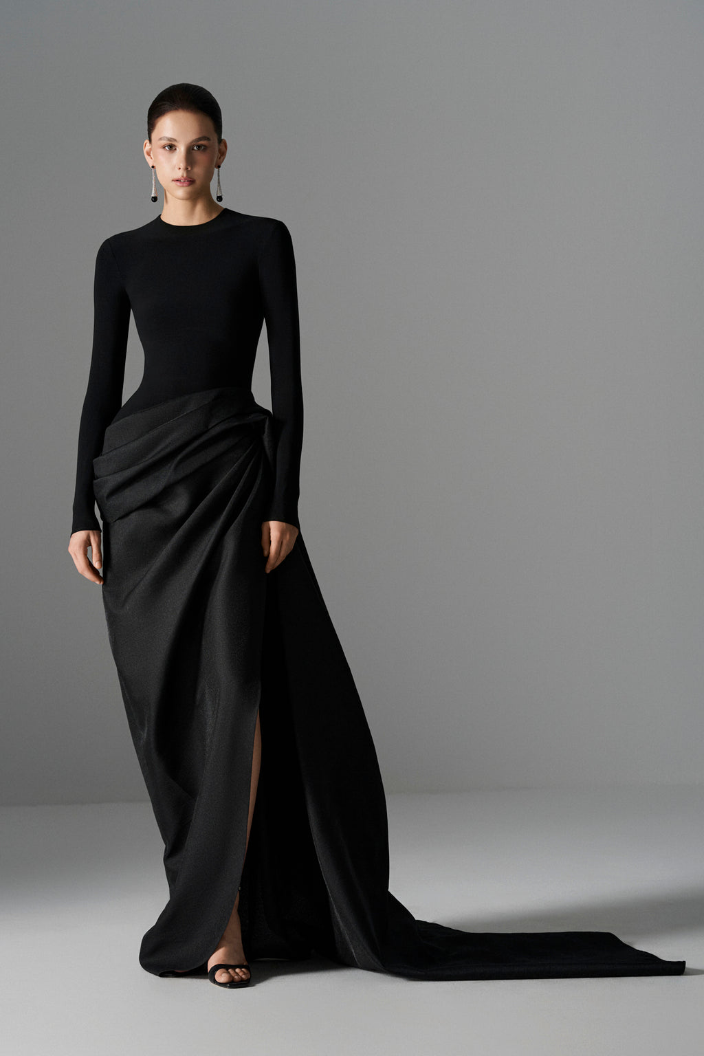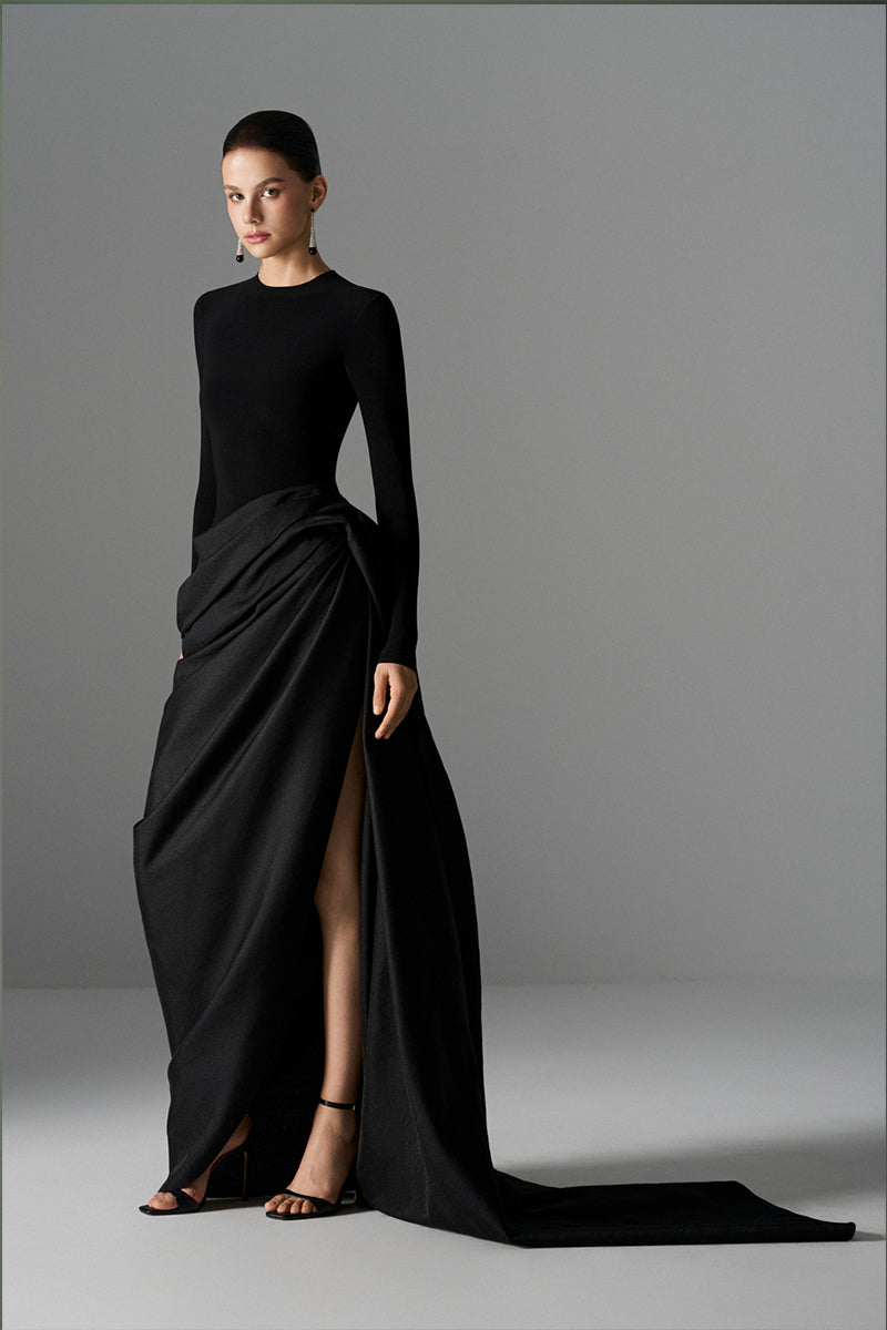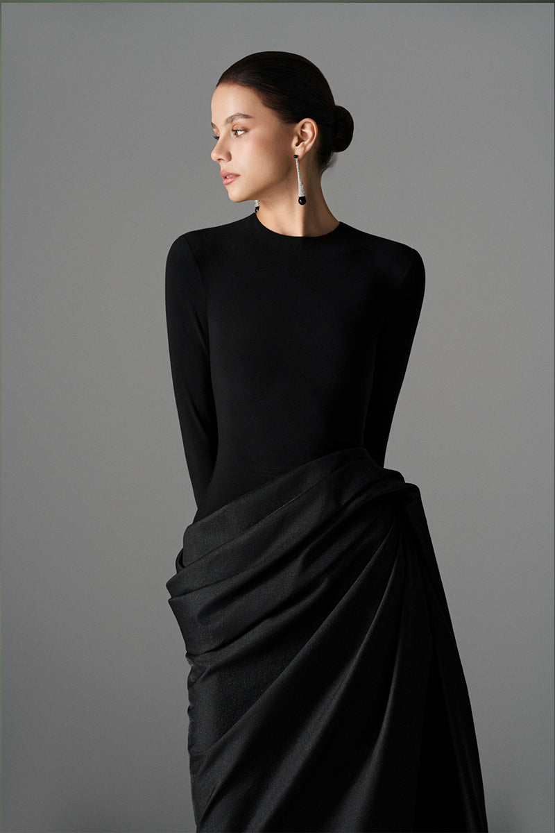 - High-waisted featuring intricate draping and ruching, creating a rich texture.
