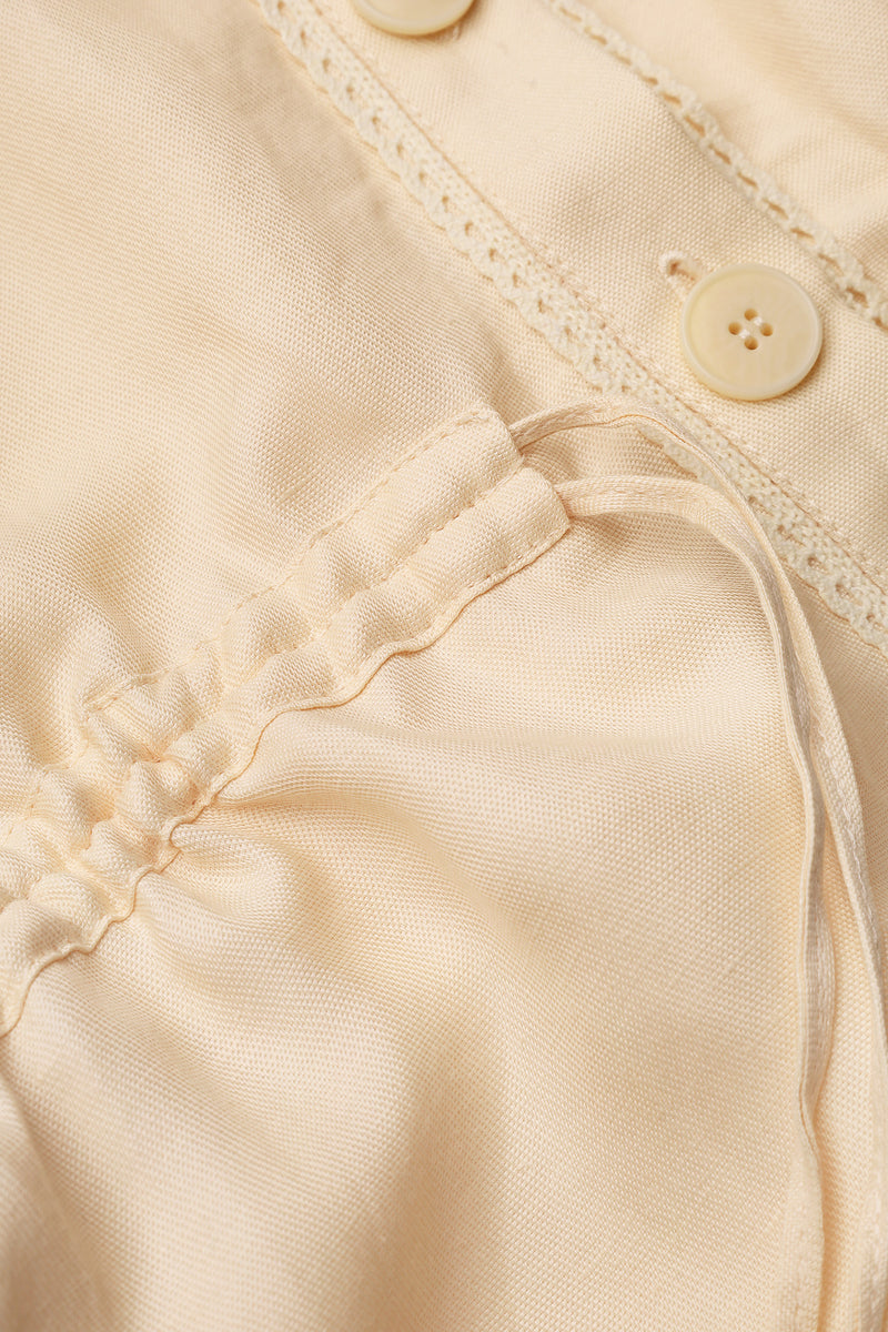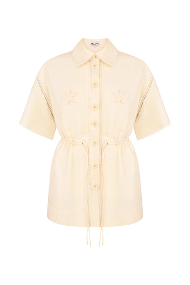 - Hand-crocheted floral appliqués and delicate lace inserts on the sleeves for a feminine touch