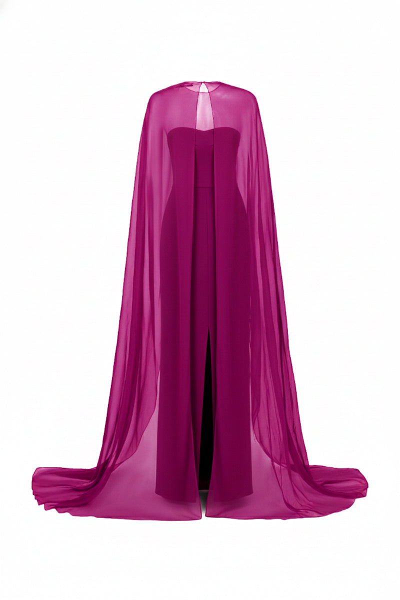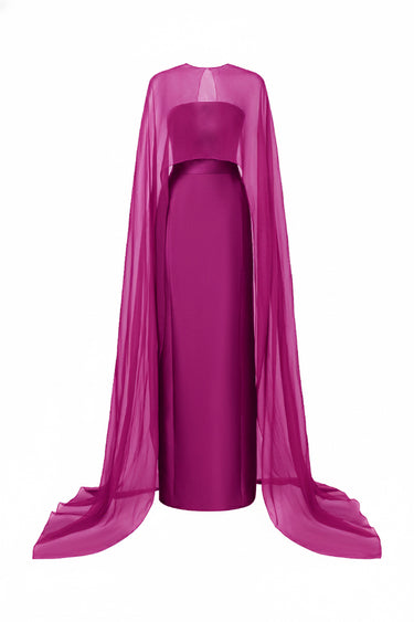 - Sheer cape overlay draped from the shoulders