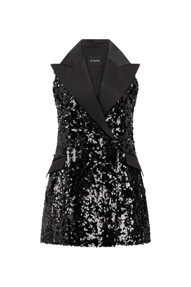 - Black sequin blazer dress with a sculptural bell-shaped silhouette